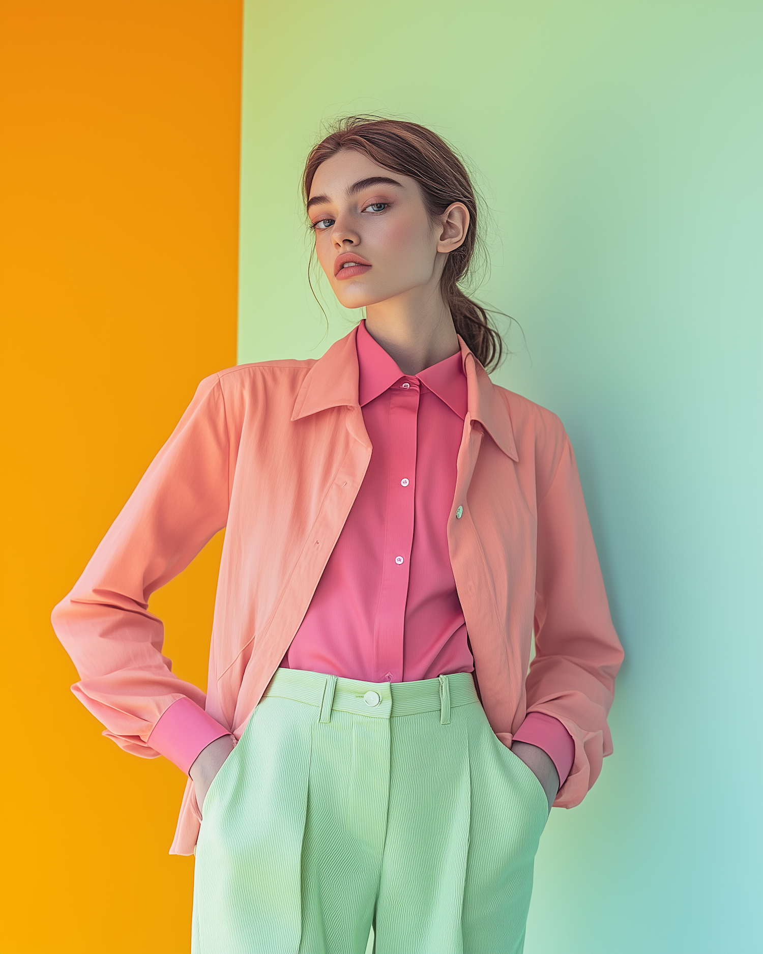 Stylish woman in coral pink jacket and pastel green trousers against vibrant orange and mint green background.