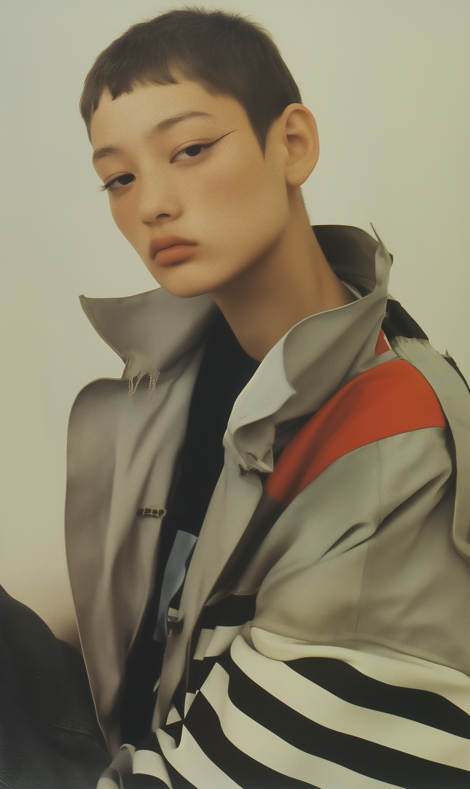 Stylish portrait of an Asian individual with bold eyeliner and a modern jacket, set against a neutral background.
