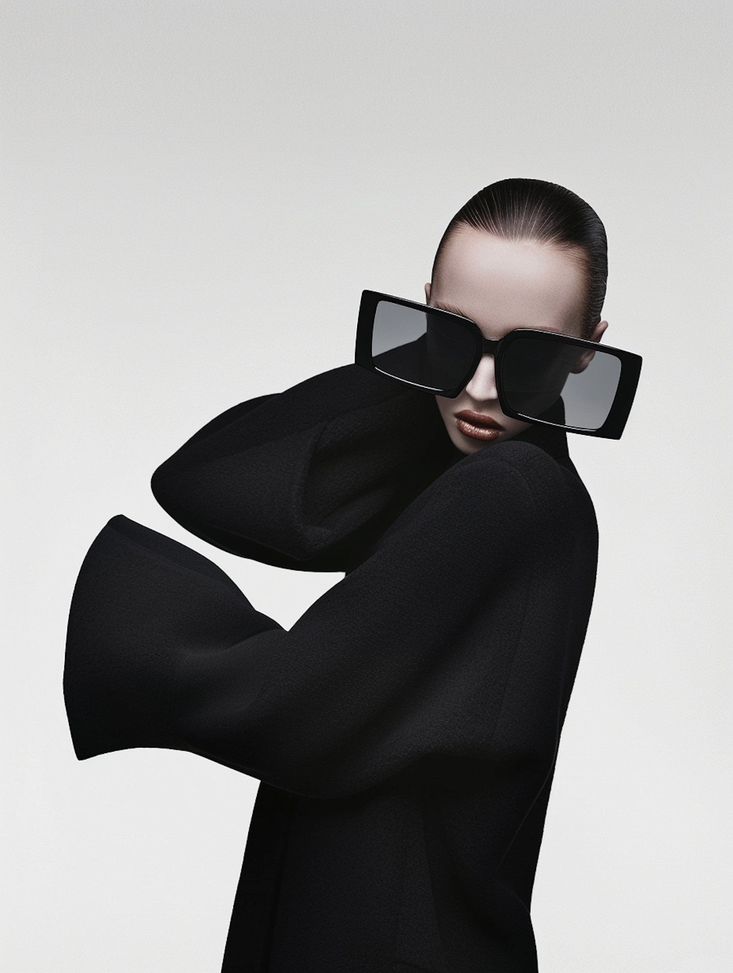 Stylish individual in oversized sunglasses and black attire against a minimalist gray background, exuding modern elegance.