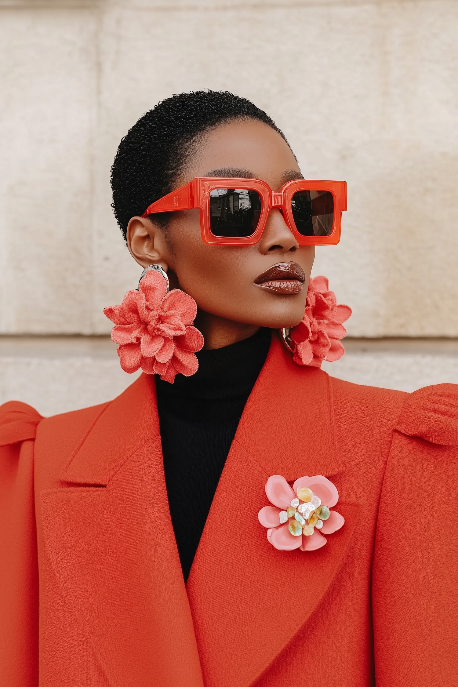 Stylish woman in red sunglasses and coat with floral accessories, exuding confidence and elegance against a neutral background.