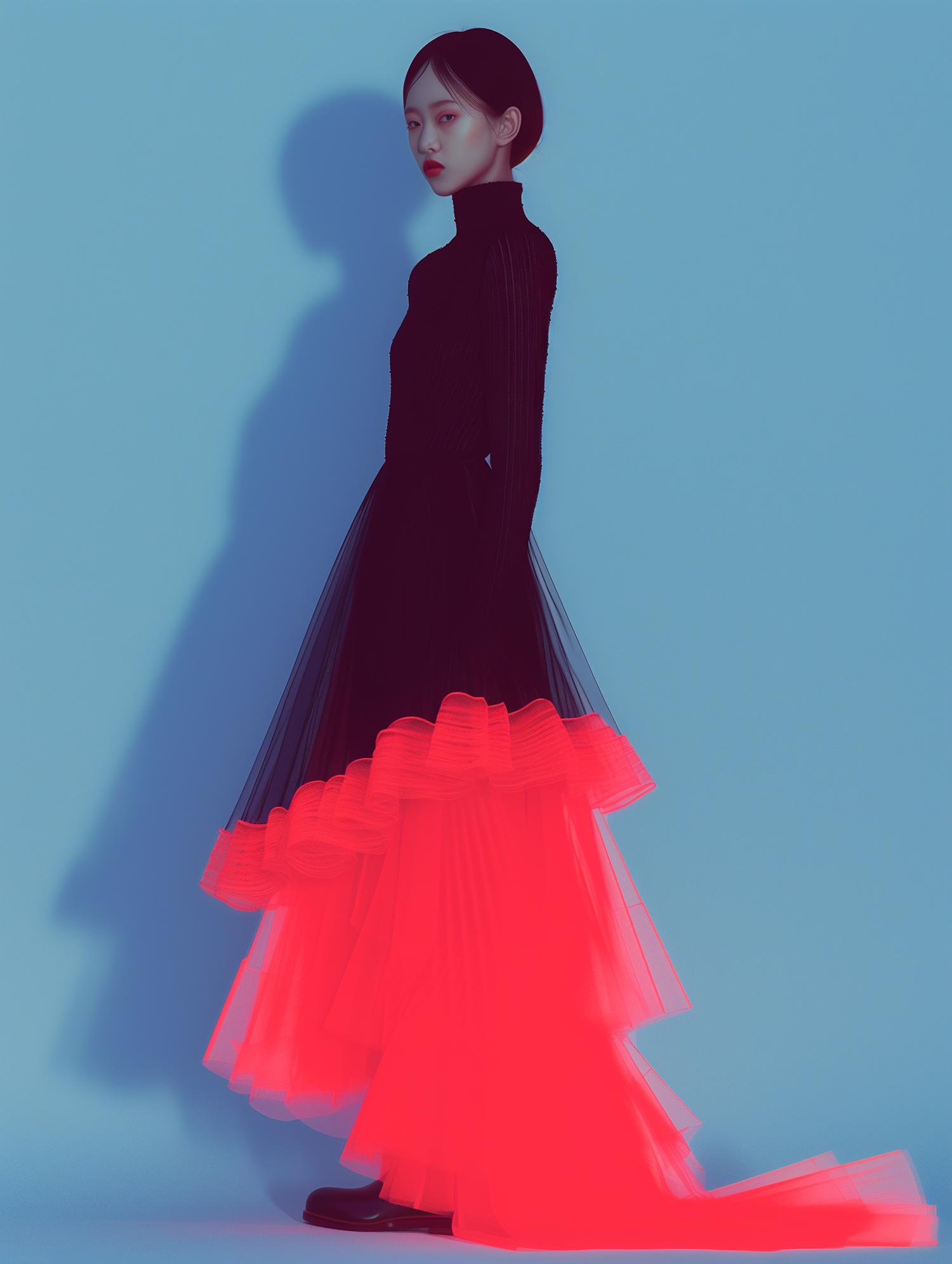 Asian woman in a black and neon pink dress against a blue background, showcasing a minimalist and dramatic fashion style.