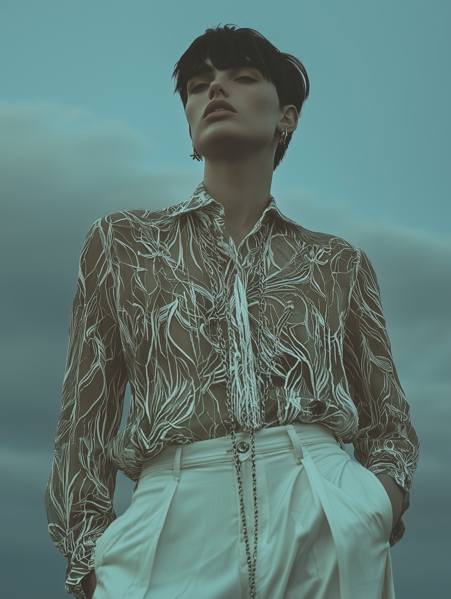 Elegant person in sheer patterned blouse and white trousers against a teal sky, exuding confidence and style.