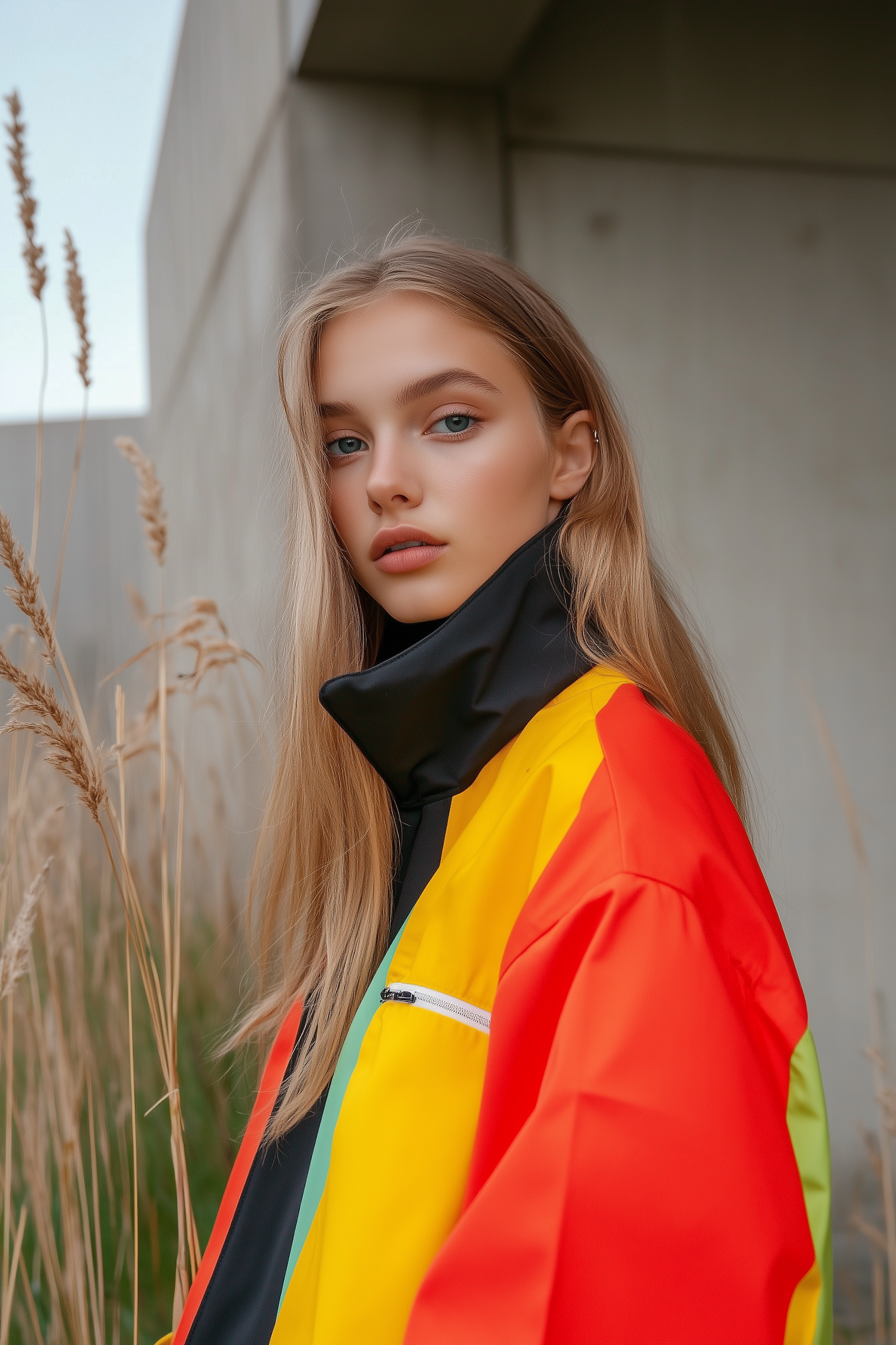 Young woman in a colorful jacket stands outdoors, surrounded by tall grasses and concrete, exuding a modern, urban vibe.