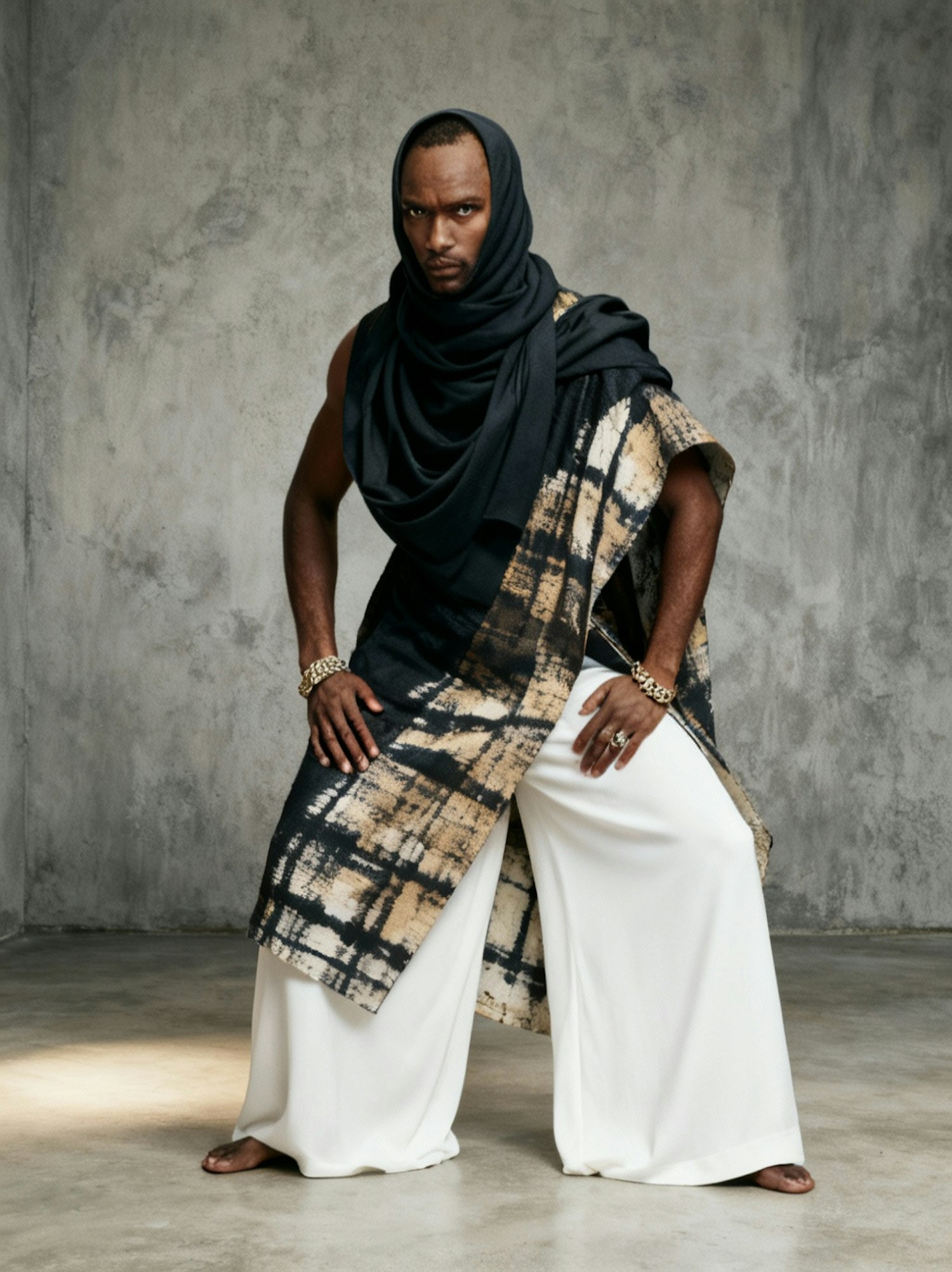 A stylish individual poses in a patterned drape and white trousers, accessorized with jewelry, against a textured gray background.