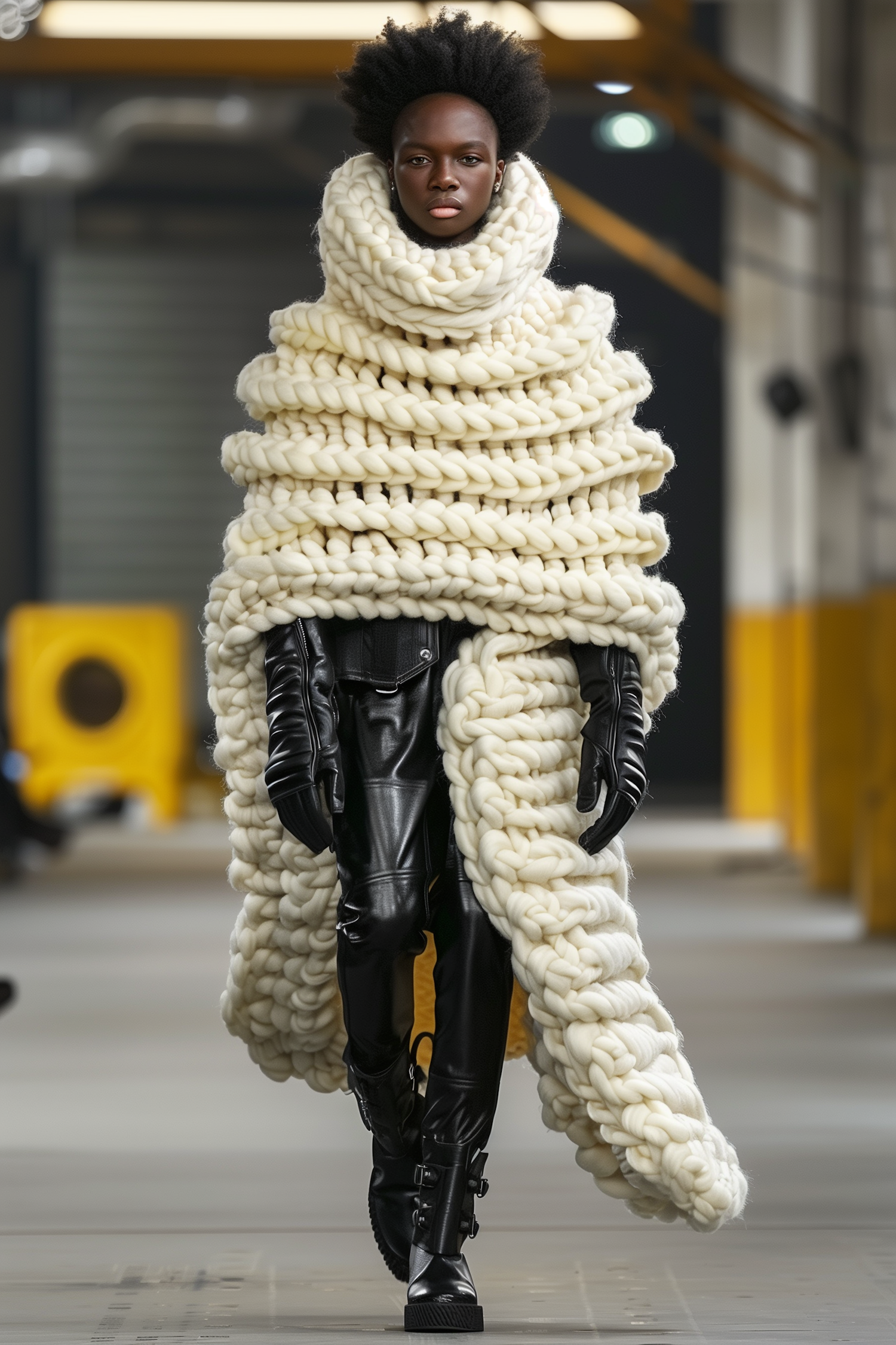 Model in oversized chunky knit coat and black leather gloves on industrial runway.