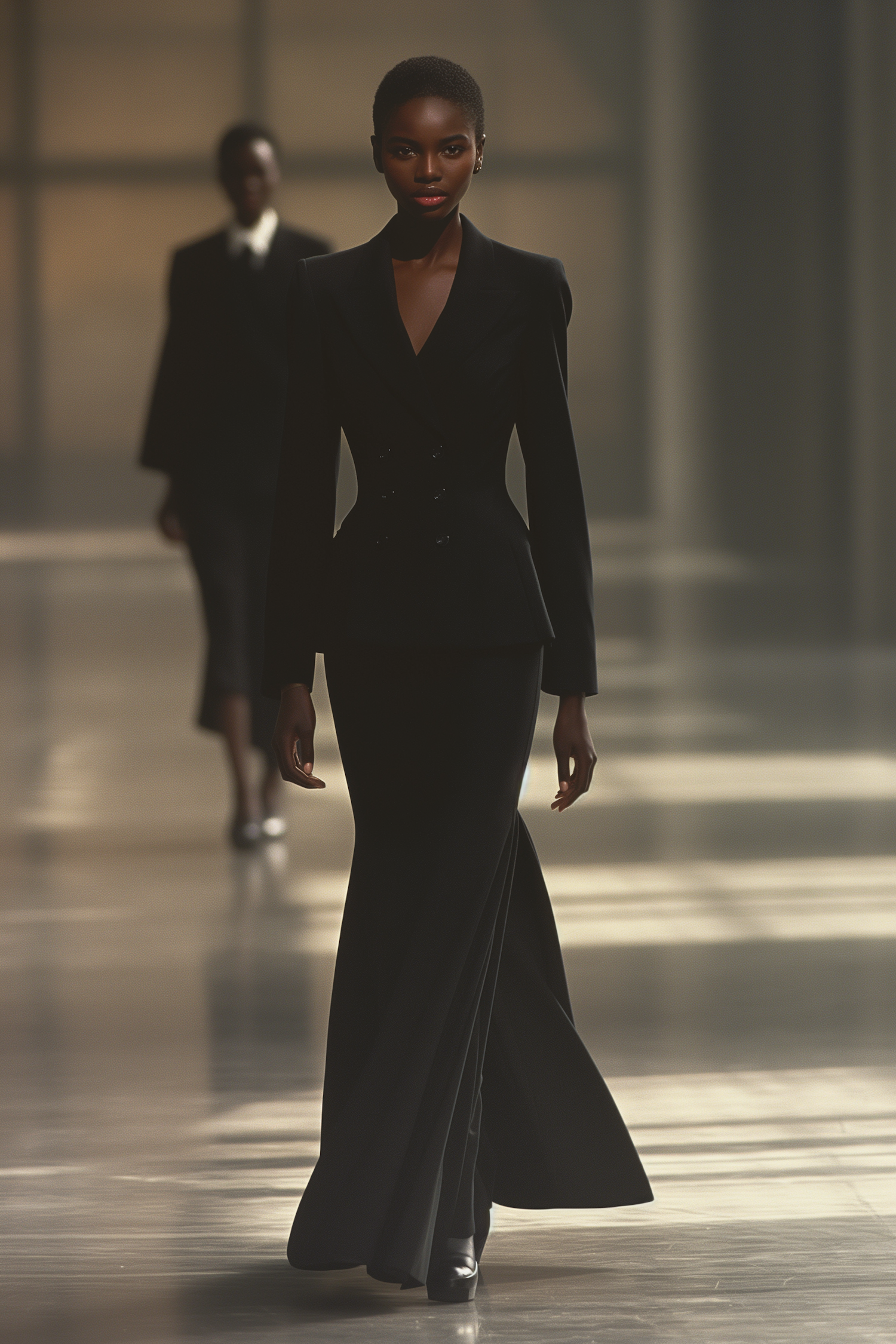 Elegant black woman in a sleek black gown walks confidently on a runway, exuding sophistication and style in a fashion show setting.