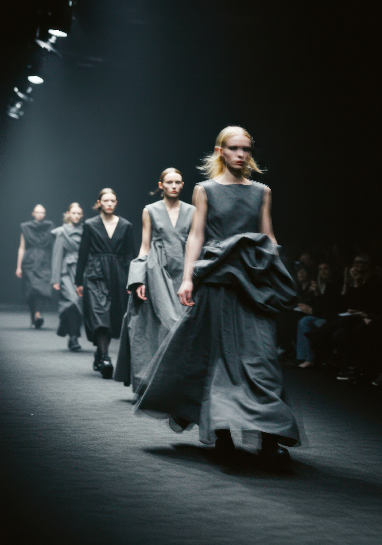 Models in avant-garde gray outfits walk a dimly lit runway, showcasing dramatic designs in a high-fashion setting.