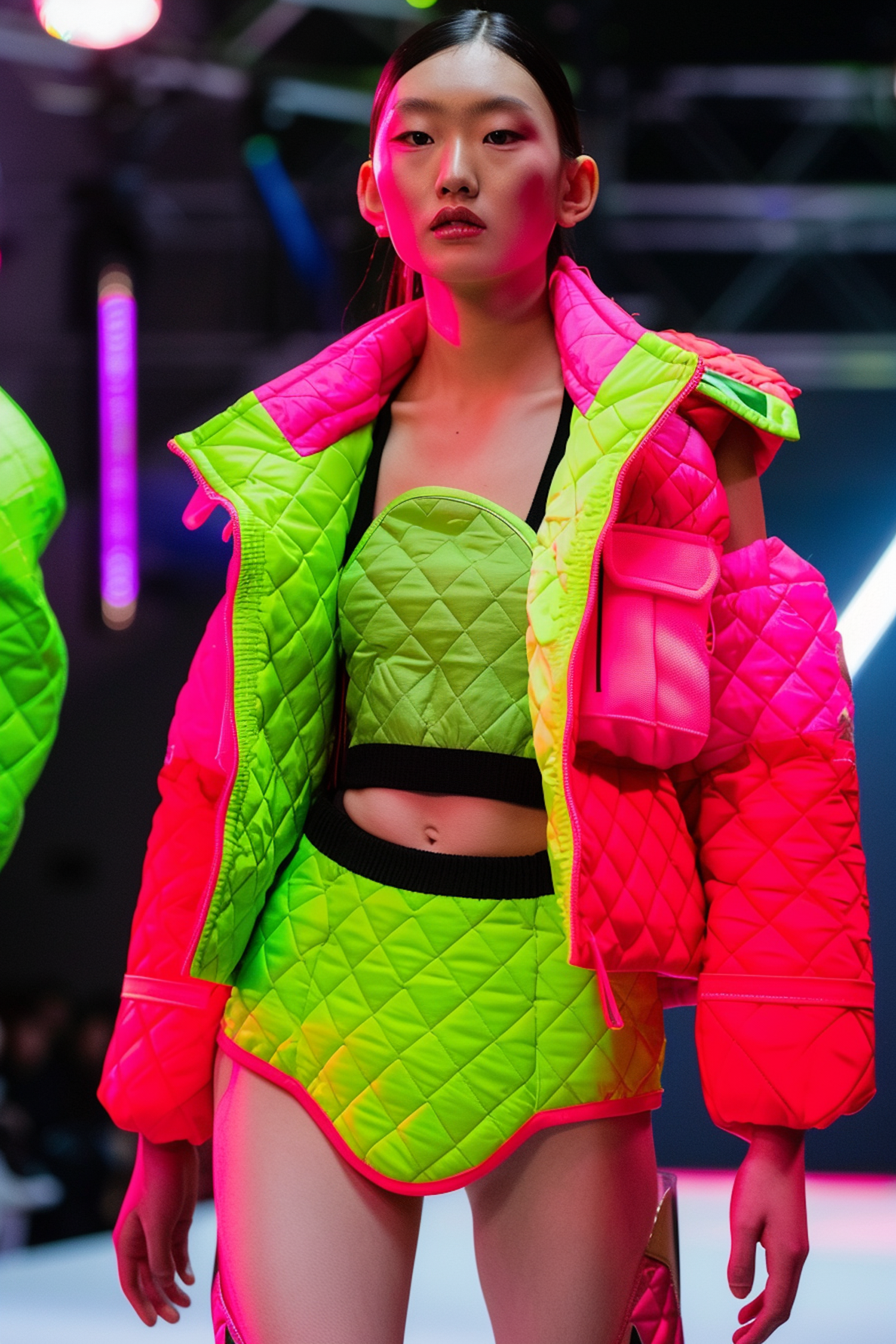 Model in neon quilted outfit on runway, featuring vibrant pink and green colors. Striking fashion statement with bold lighting.