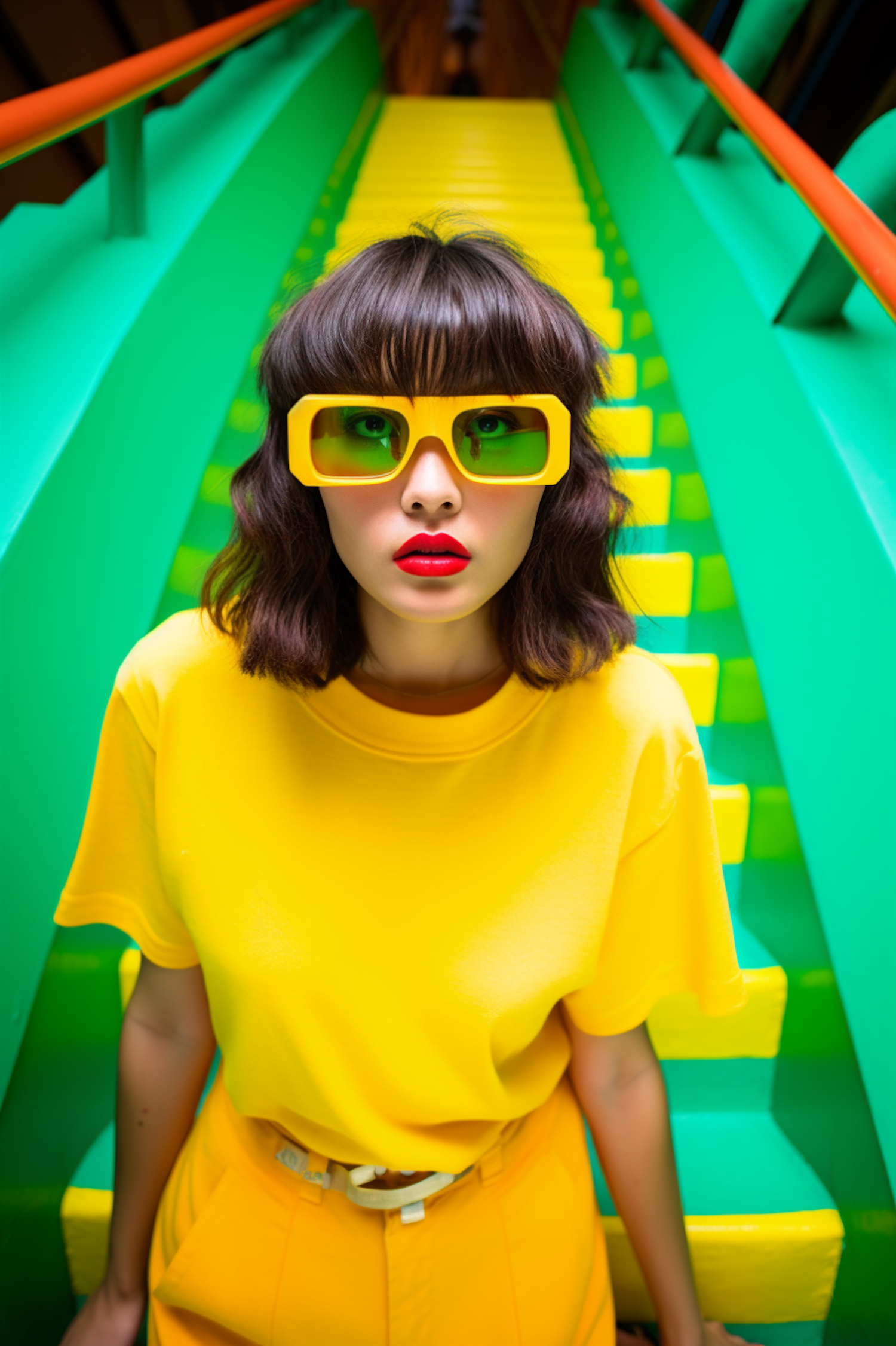 Stylish woman in yellow outfit and sunglasses on vibrant green and yellow staircase, exuding bold fashion and color contrast.