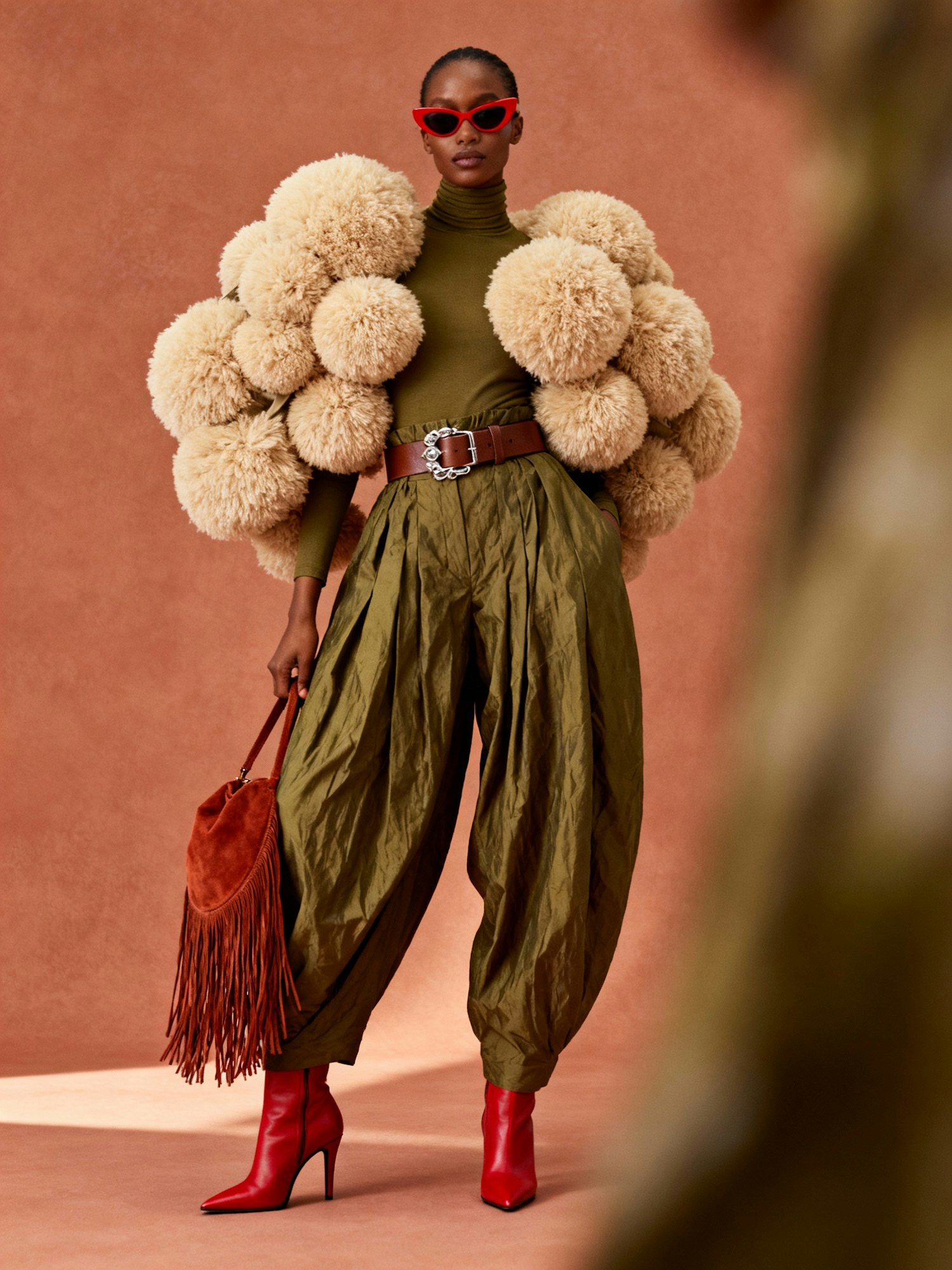 A confident woman standing against a plain background that complements her warm brown skin tone, wearing a voluminous top made of large, fluffy beige pom-pom-like elements layered over a fitted olive-green turtleneck. She pairs it with high-waisted, loose-fitting olive-green pants with a crinkled texture, cinched at the waist with a wide brown belt featuring metallic details. Accessories include red heeled boots, a rust-colored fringed handbag, and red cat-eye sunglasses. The look blends sculptural texture, earthy tones, and avant-garde elegance in a fashion-forward composition.