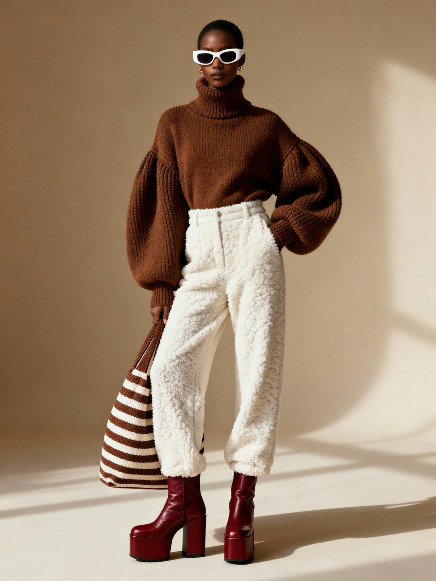 A confident woman standing against a plain background that complements her warm brown skin tone, wearing a chunky brown turtleneck sweater with voluminous sleeves paired with high-waisted, textured white fleece pants. She completes the look with deep red platform boots, white-framed futuristic sunglasses, and carries a large brown-and-white striped bag. The composition blends cozy maximalism with avant-garde polish, highlighting sculptural knitwear, bold footwear, and editorial styling in a luxurious, modern fashion context.