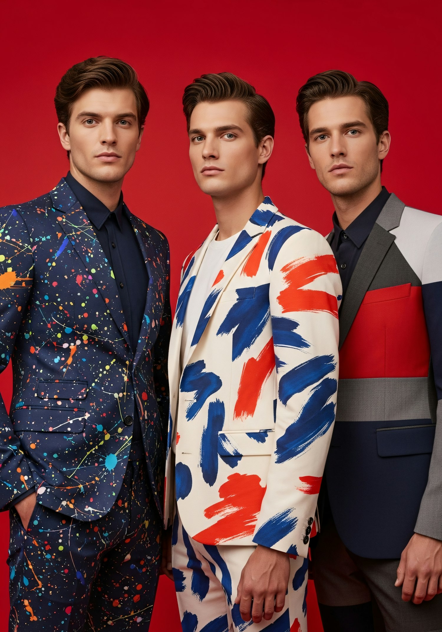 Three individuals in vibrant, patterned suits stand against a red background, showcasing bold and modern fashion styles.