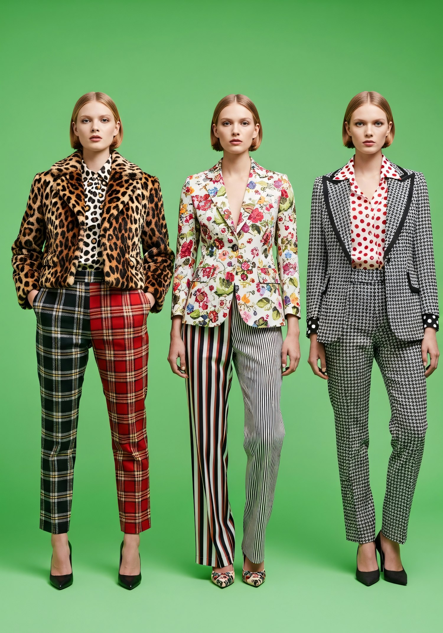 Three women in bold, patterned outfits stand against a green background, showcasing a mix of leopard, floral, and houndstooth designs.