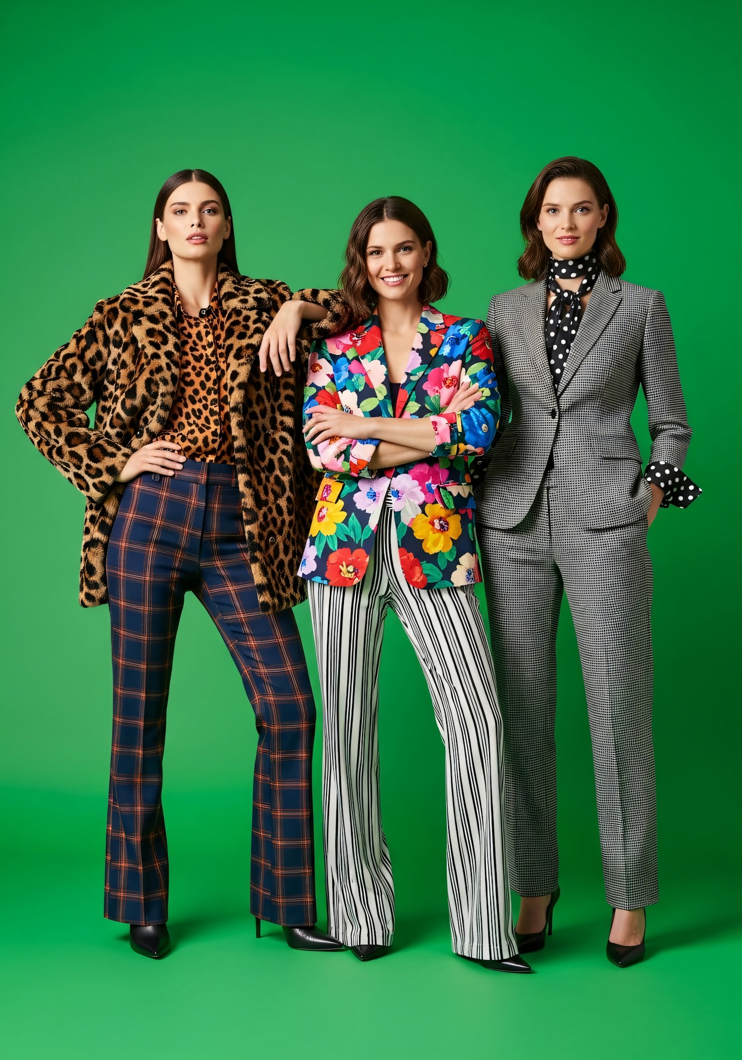 Three women in bold, stylish outfits pose confidently against a green background, showcasing unique patterns and vibrant fashion.