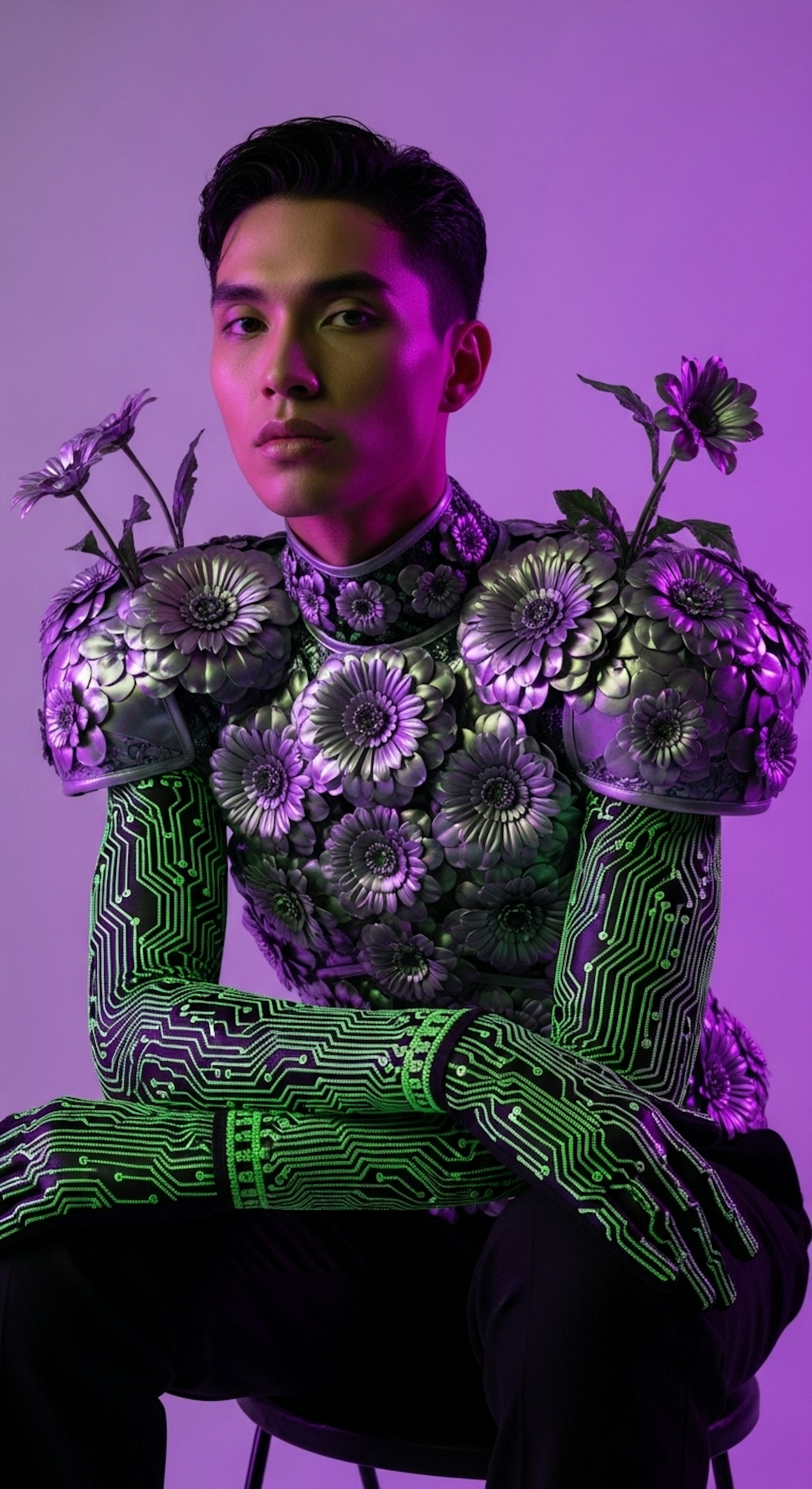 A futuristic design blending floral metallic armor with neon circuit patterns on a vibrant purple backdrop.