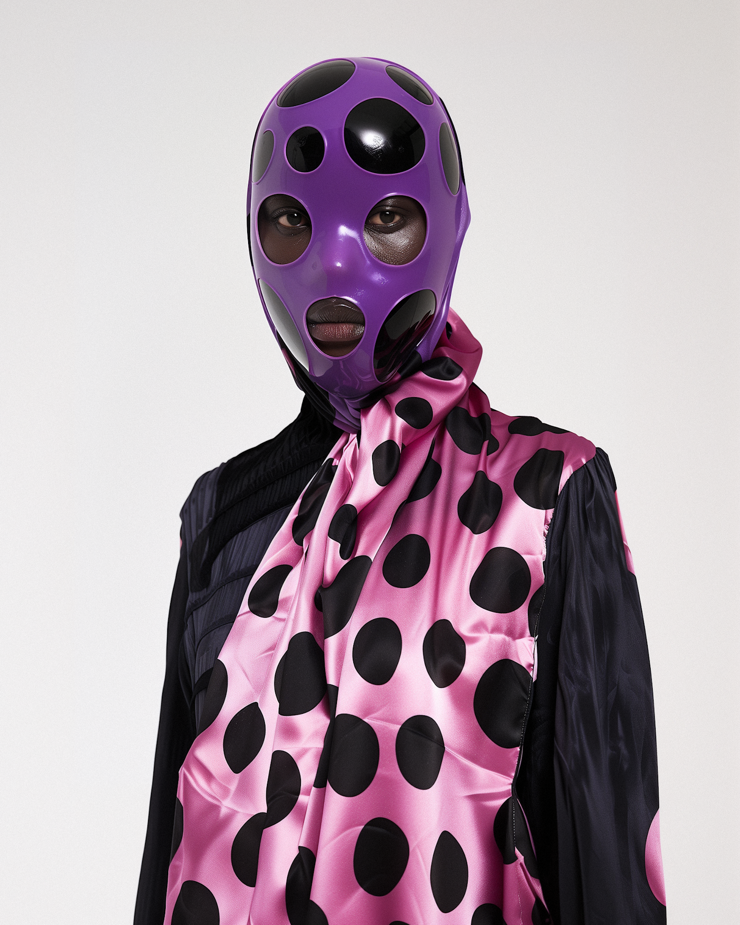 Person in a purple polka-dot mask and pink polka-dot outfit, creating a bold and artistic fashion statement.