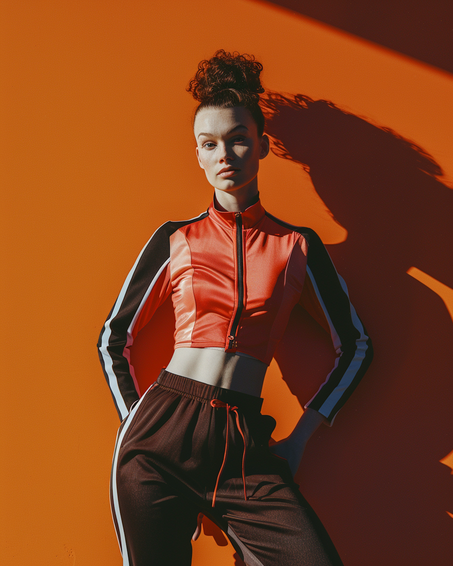 Confident woman in sporty red outfit against vibrant orange background, casting a dramatic shadow. Bold and dynamic fashion portrait.