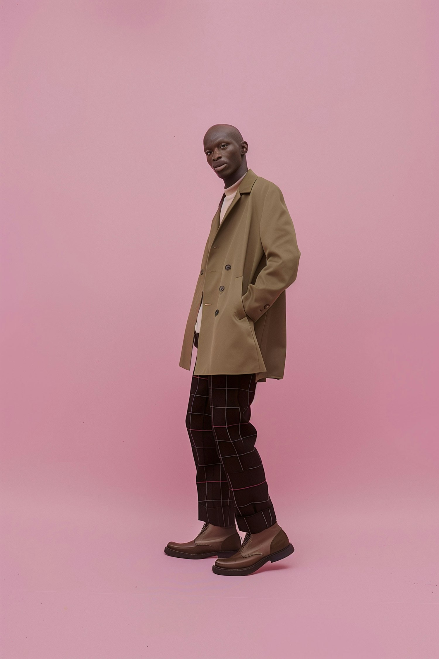 Stylish man in olive coat and checkered pants against a pink background, exuding modern elegance and confidence.