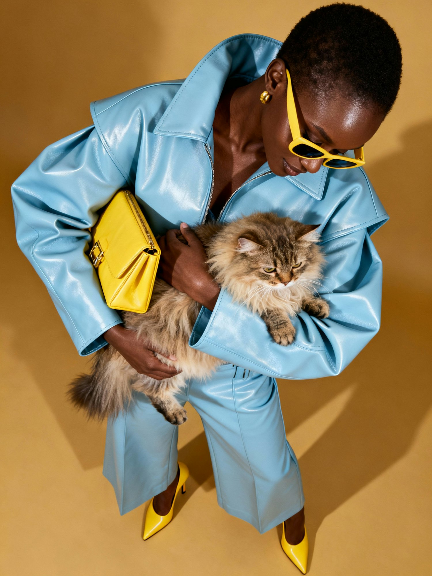 A fashionable person in a blue leather outfit with yellow accessories holds a fluffy cat in a warm-toned setting, creating a bold, stylish look.