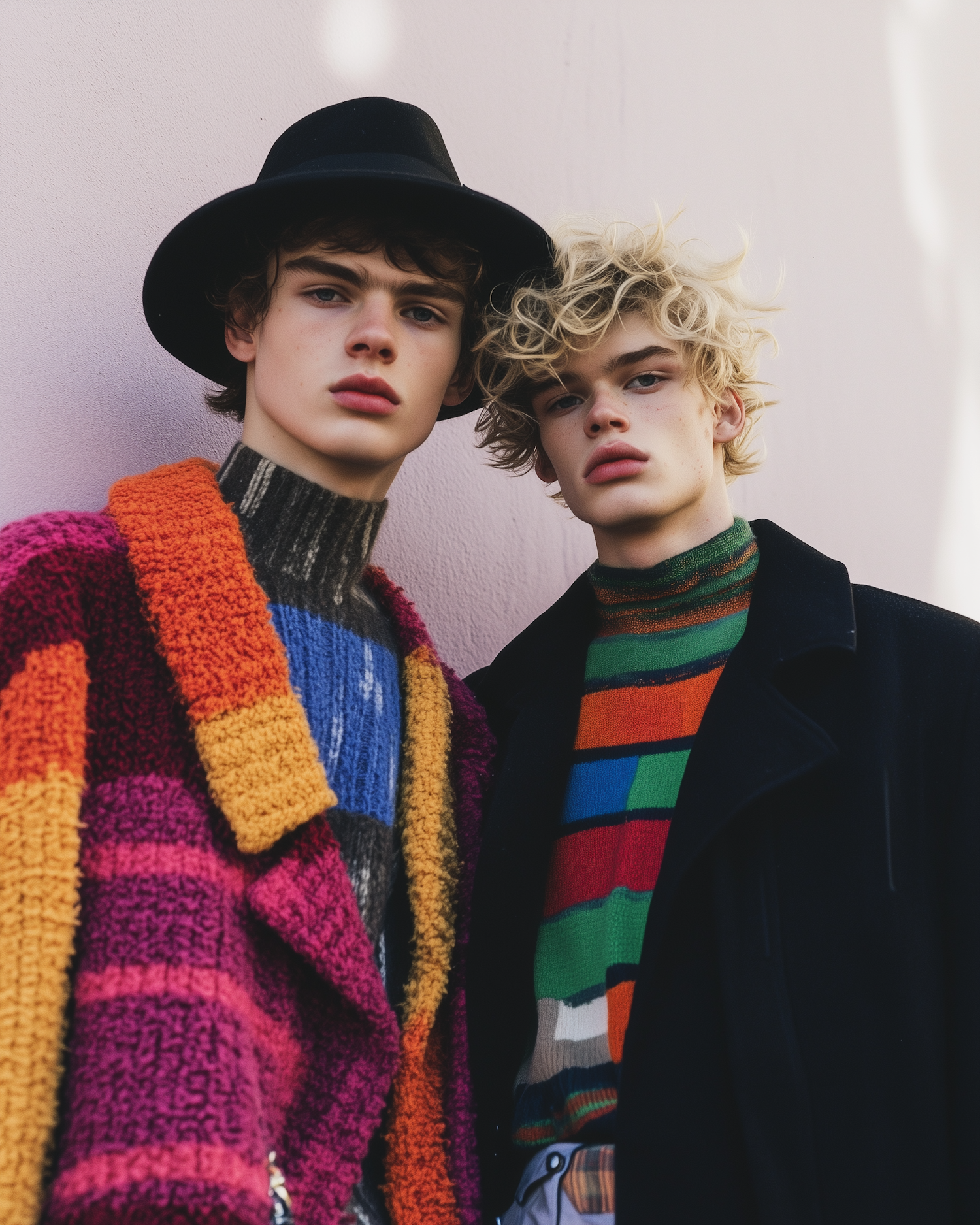 Two stylish young men in colorful, textured outfits pose against a light wall, showcasing bold fashion choices and serious expressions.