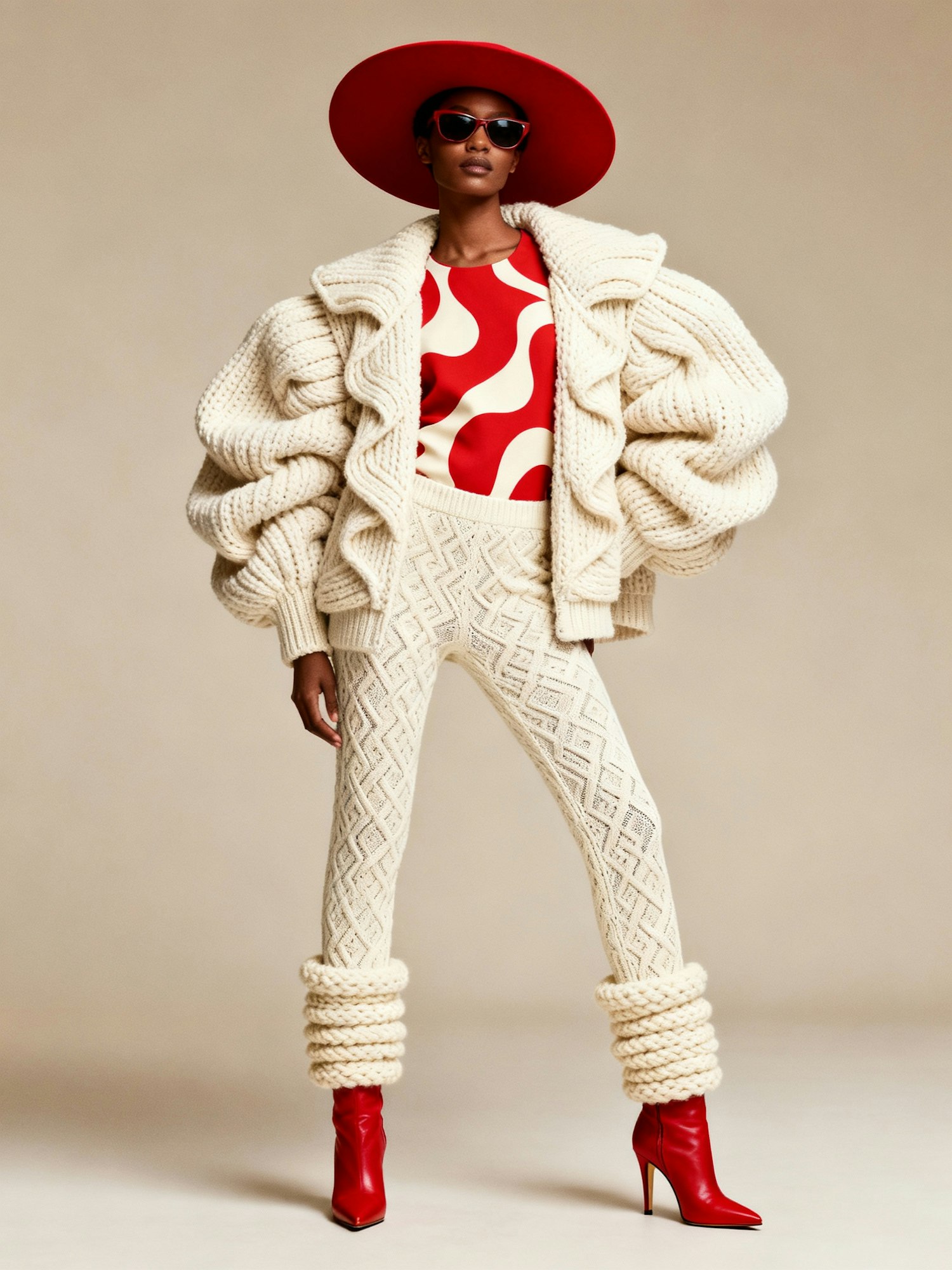 A confident woman standing against a plain background that complements her warm brown skin tone, wearing a voluminous cream-colored knitted jacket with exaggerated sleeves over a red and cream abstract-patterned top. She pairs it with intricately patterned cream knit pants and red high-heeled boots featuring cream knitted extensions. Accessories include a wide-brimmed red hat, sunglasses, and a bold editorial stance. The look blends textile artistry, sculptural layering, and avant-garde elegance in a fashion-forward composition