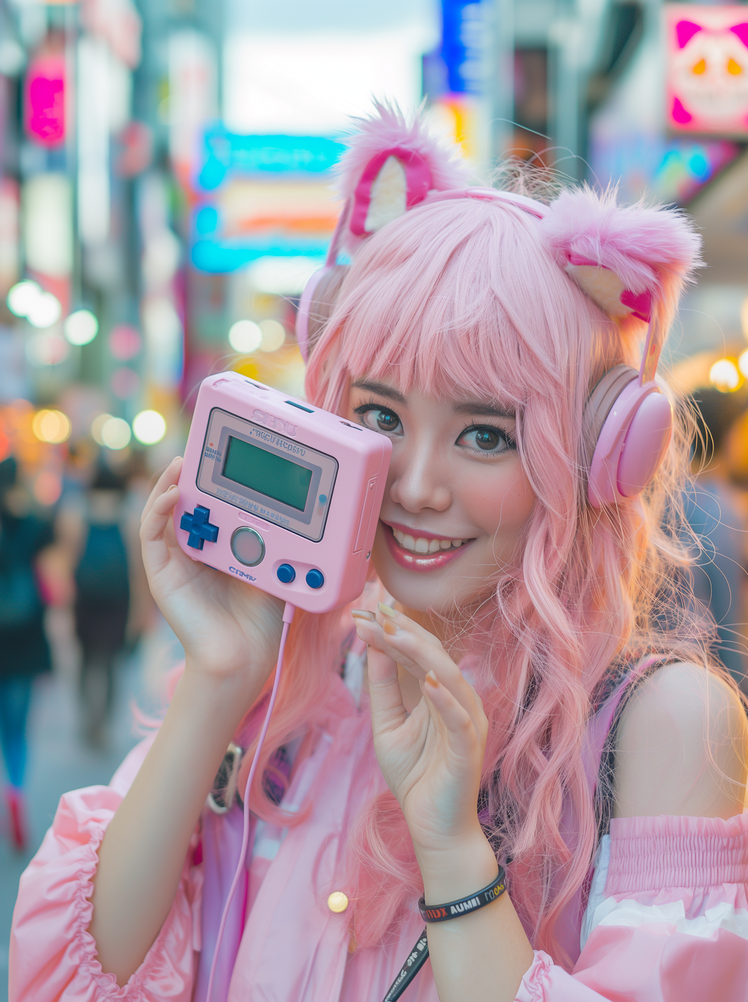 Playful scene with a young woman in pink cat ear headphones holding a retro gaming device in a vibrant city street.