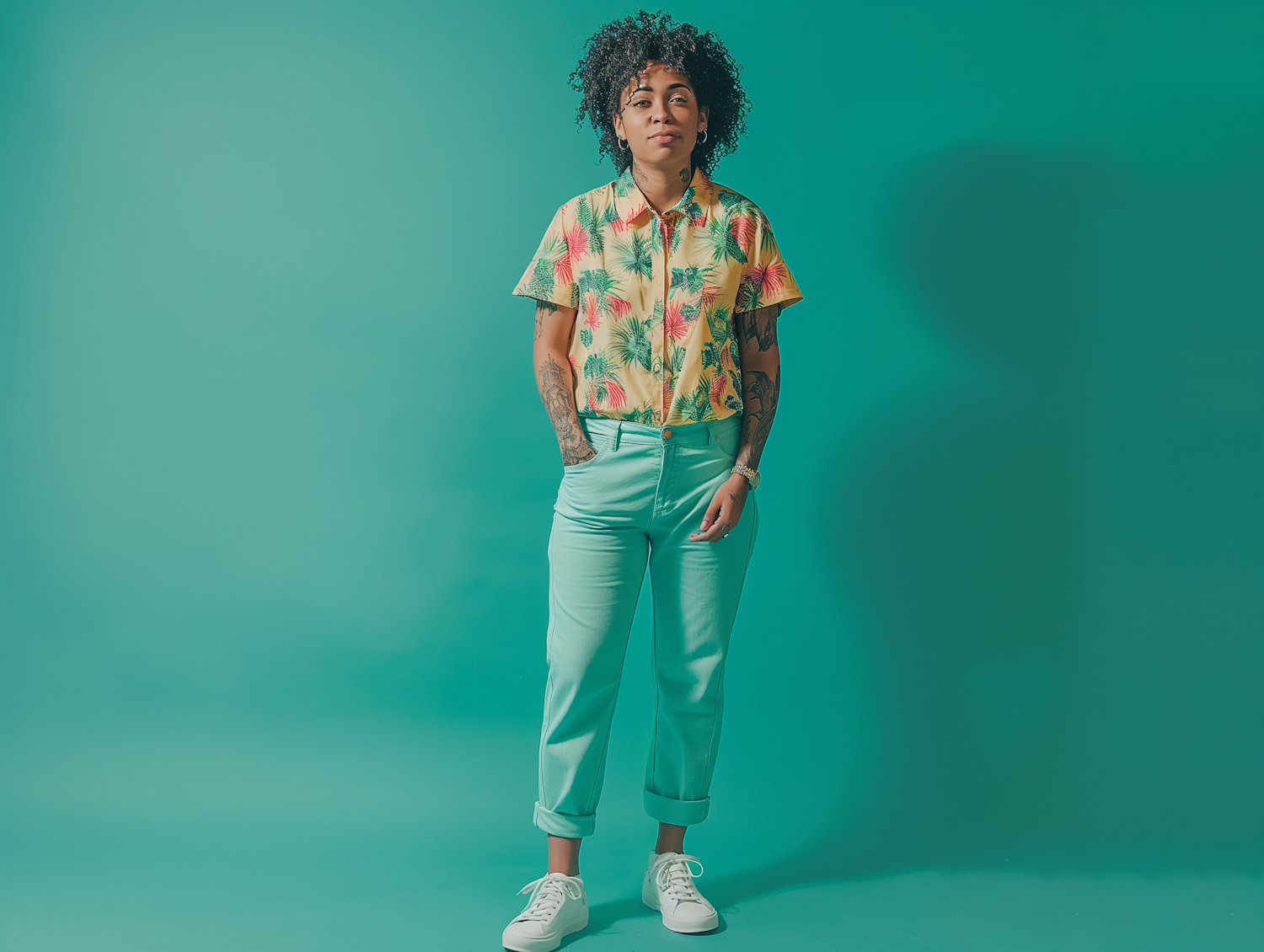 Stylish individual in tropical print shirt and teal pants against a teal backdrop, showcasing a casual and confident look.