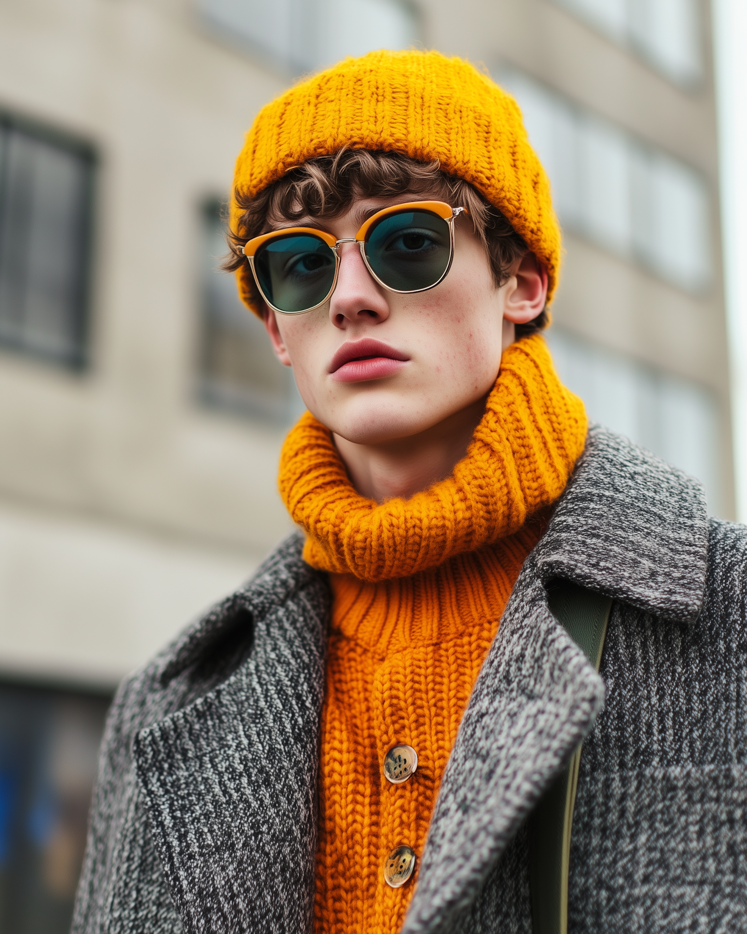Stylish young man in orange knitwear and sunglasses, wearing a gray coat in an urban setting. Fashion-forward and vibrant look.