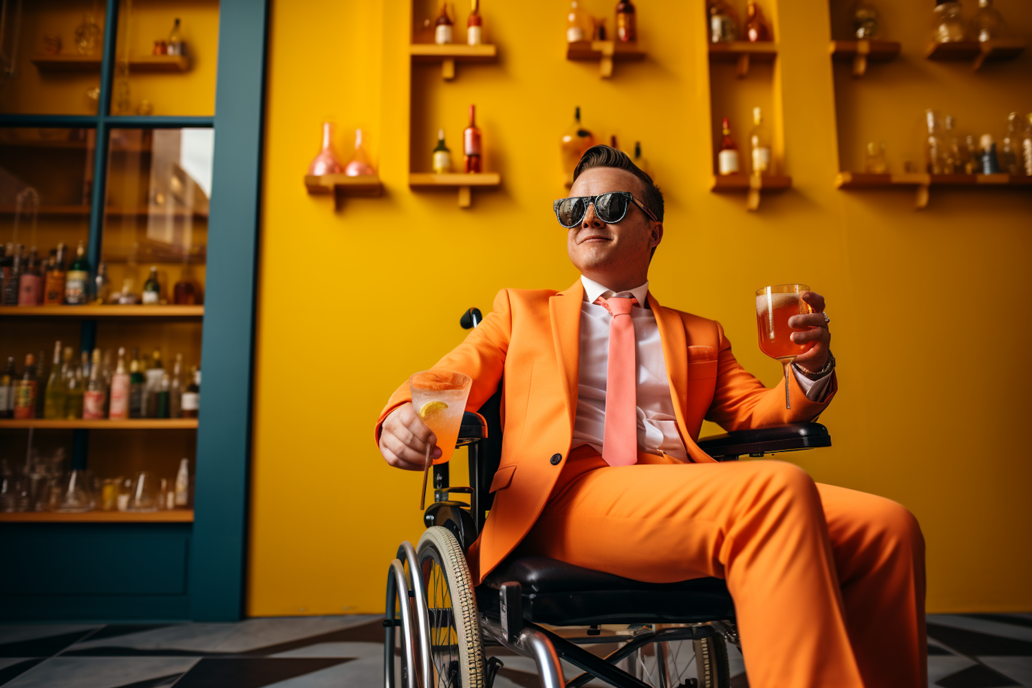 Stylish man in orange suit and sunglasses in a wheelchair, holding drinks against a vibrant yellow backdrop with bottle shelves.