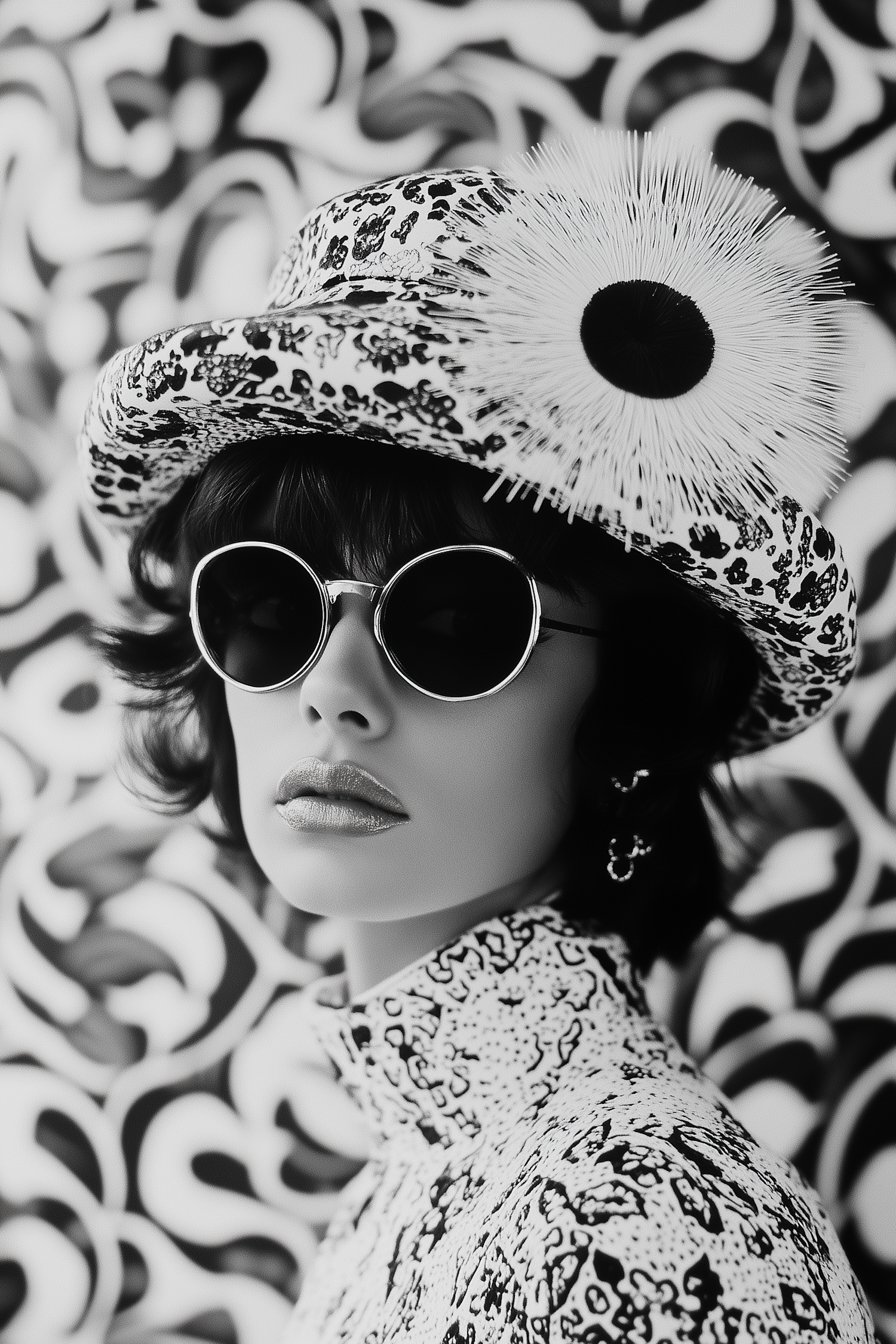 Stylish woman in patterned hat and sunglasses, black and white portrait with abstract background.