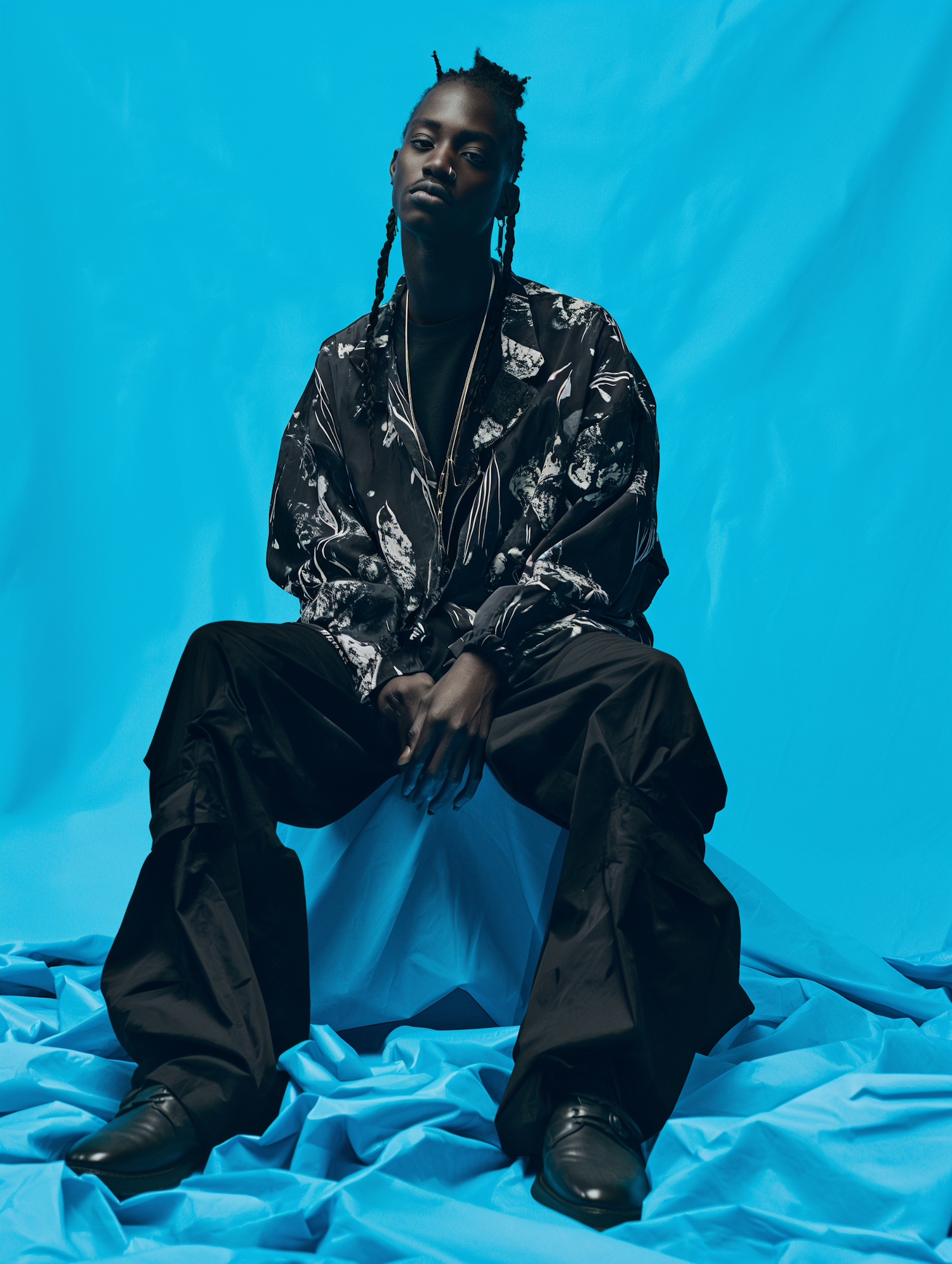 Stylish man in black patterned jacket and loose pants against a vibrant blue backdrop, exuding confidence and calm.