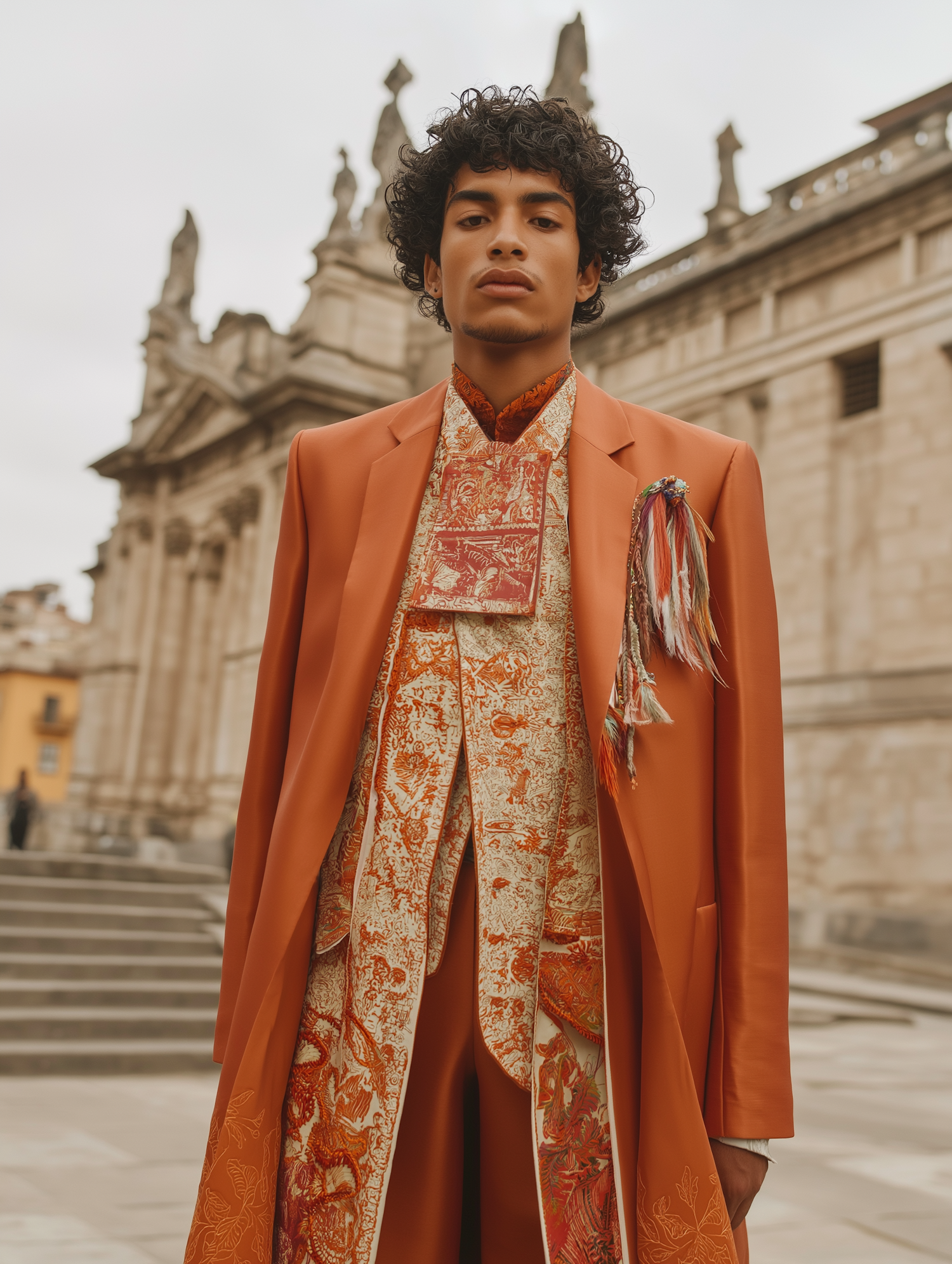 Stylish man in a burnt orange embroidered coat and ornate vest, posing confidently in front of a historic stone building.