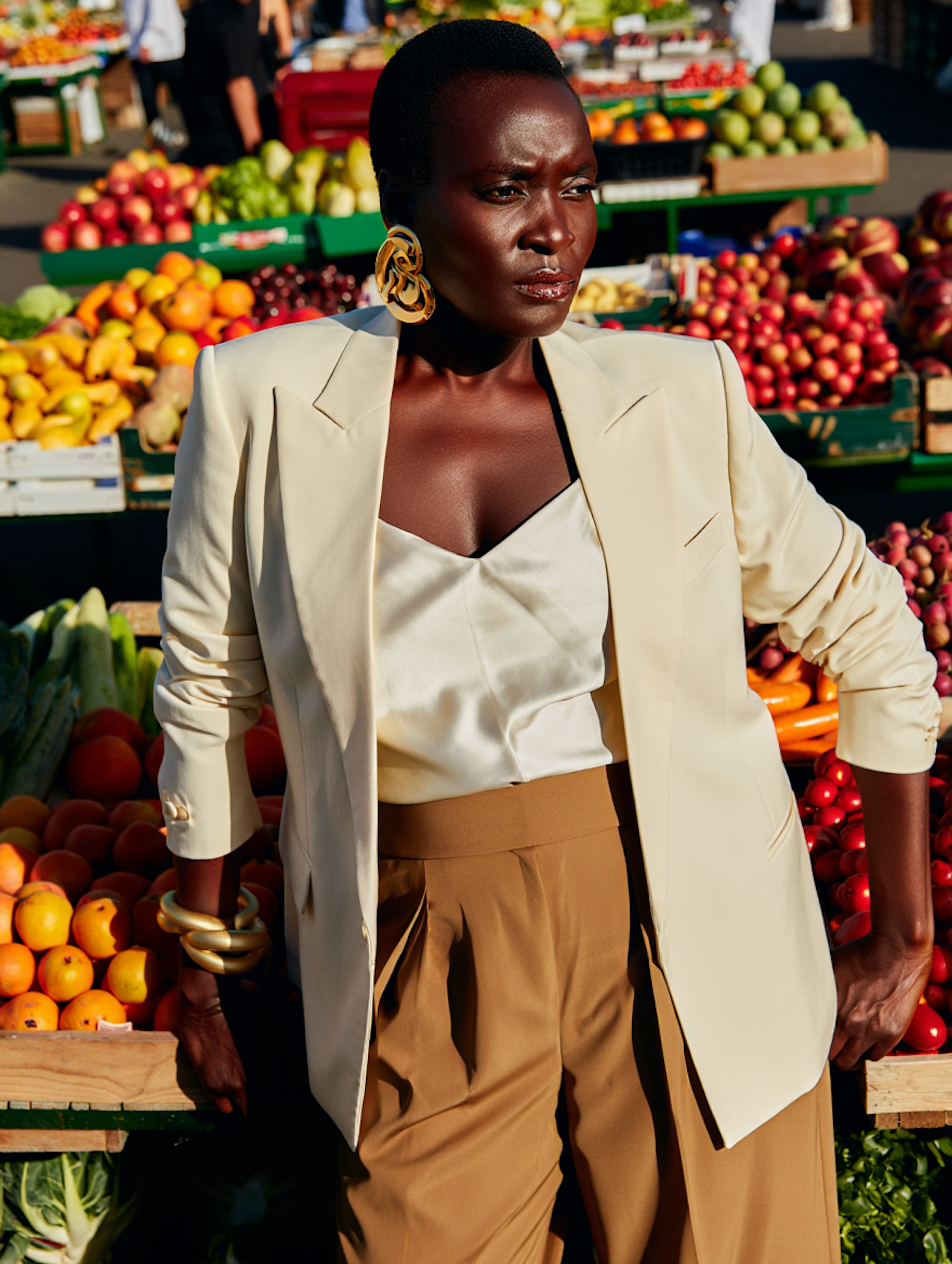 Stylish individual in a cream jacket and tan trousers at a vibrant outdoor market with colorful fruits and vegetables.