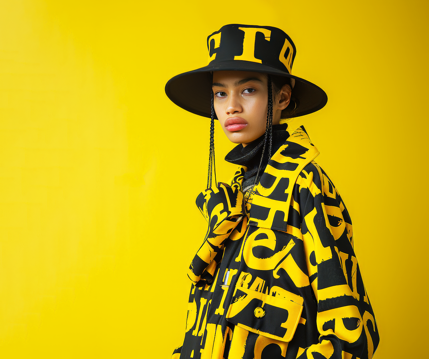 Fashionable woman in bold black and yellow lettered coat and hat against a vibrant yellow background.