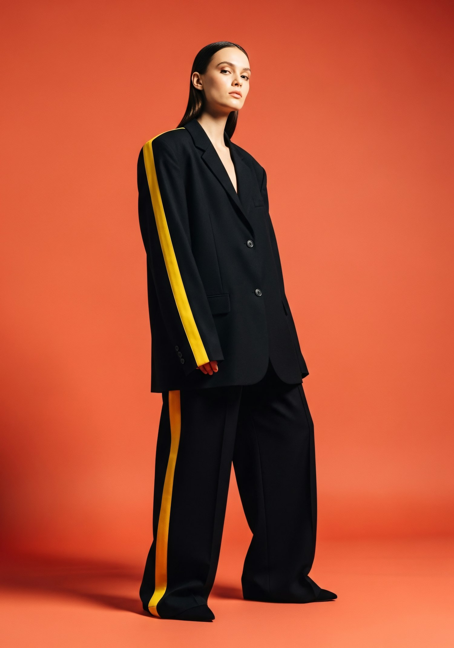 A person in a black suit with yellow stripes poses confidently against an orange background, showcasing a bold and modern fashion style.