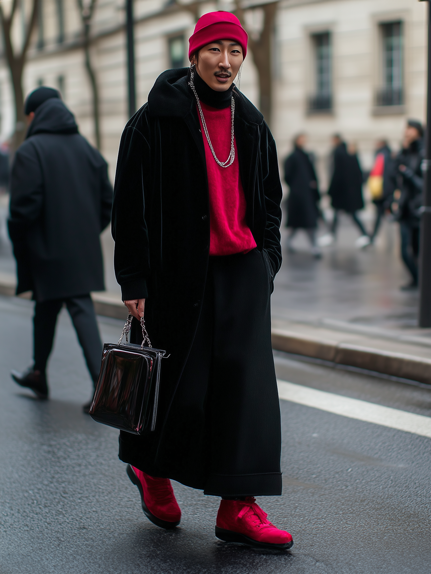 Stylish man in red and black outfit with bold accessories, including a metallic handbag and red sneakers, on a city street.