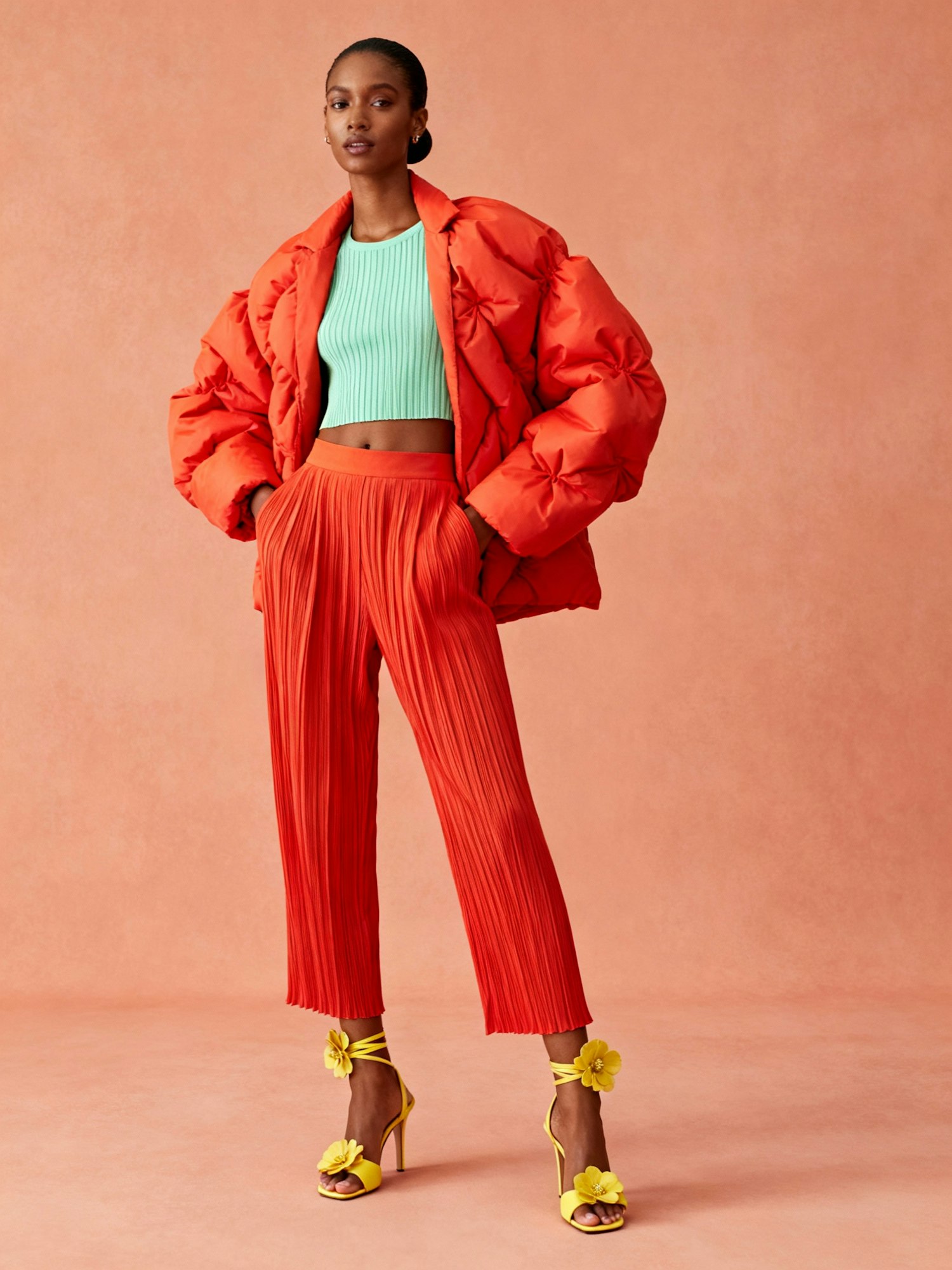 A confident woman standing against a plain background that complements her warm brown skin tone, wearing a voluminous red-orange sculptural jacket layered over a mint green cropped ribbed top. She pairs it with high-waisted, pleated red-orange trousers and yellow flower-adorned high-heeled sandals with ankle straps. Her look is completed with sleek styling and a scenic composition that blends bold color coordination, playful texture, and avant-garde elegance