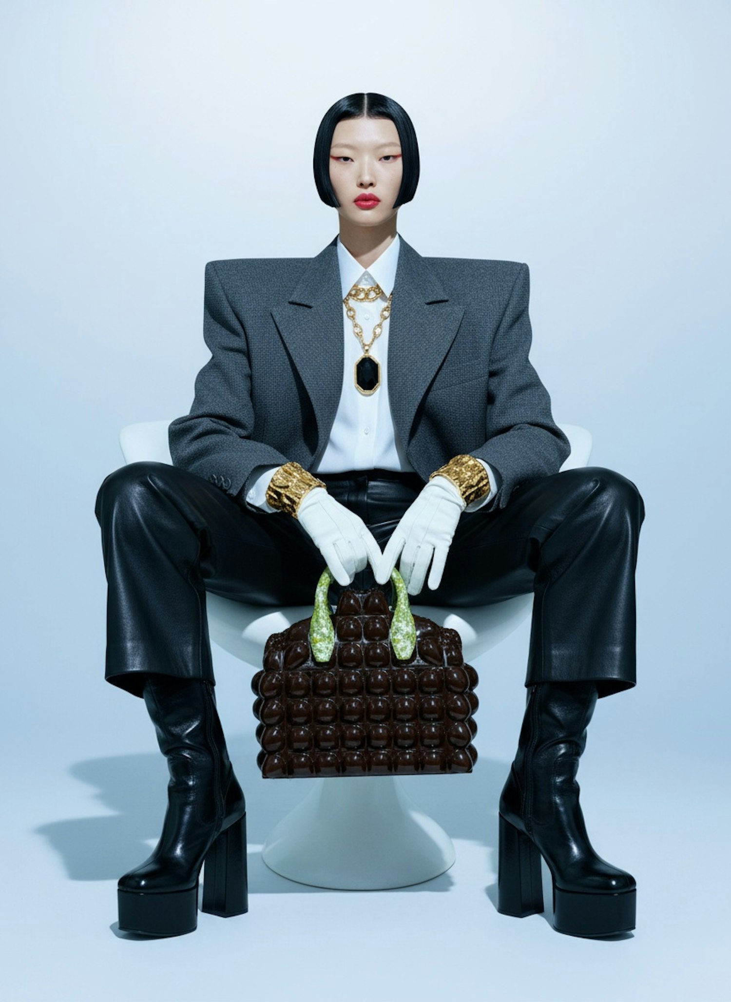 Stylish individual in a gray blazer and leather pants, accessorized with gold jewelry and a unique chocolate bar handbag.