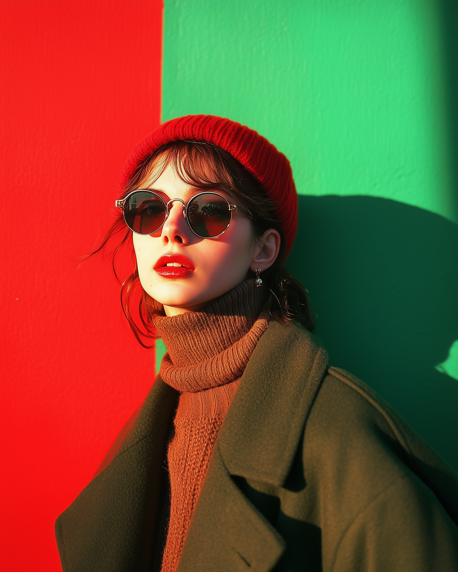 Stylish woman in red beanie and sunglasses against vibrant red and green background, wearing a brown turtleneck and green coat.