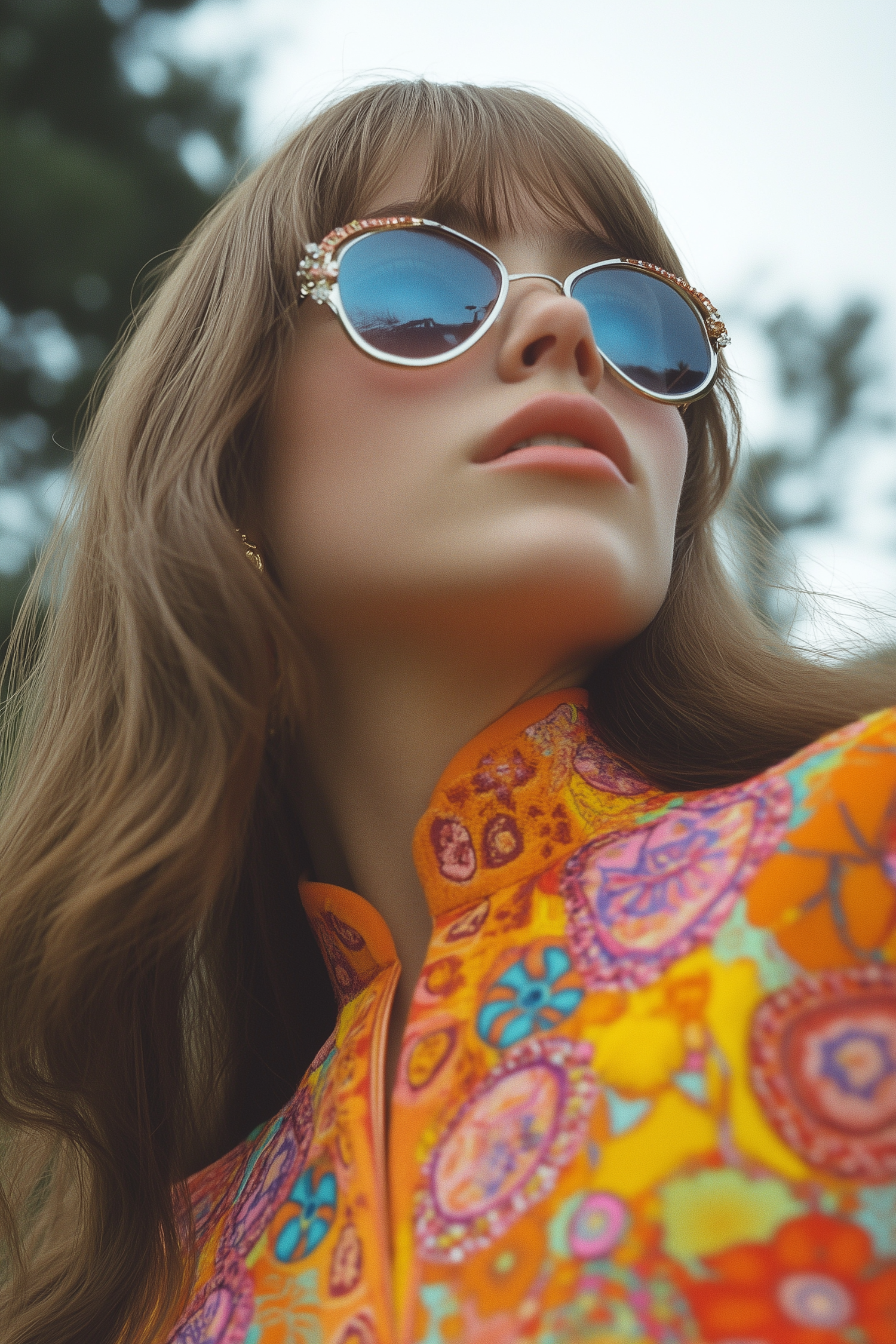 Stylish woman in vibrant patterned top and round sunglasses, gazing upward with confidence in an outdoor setting.