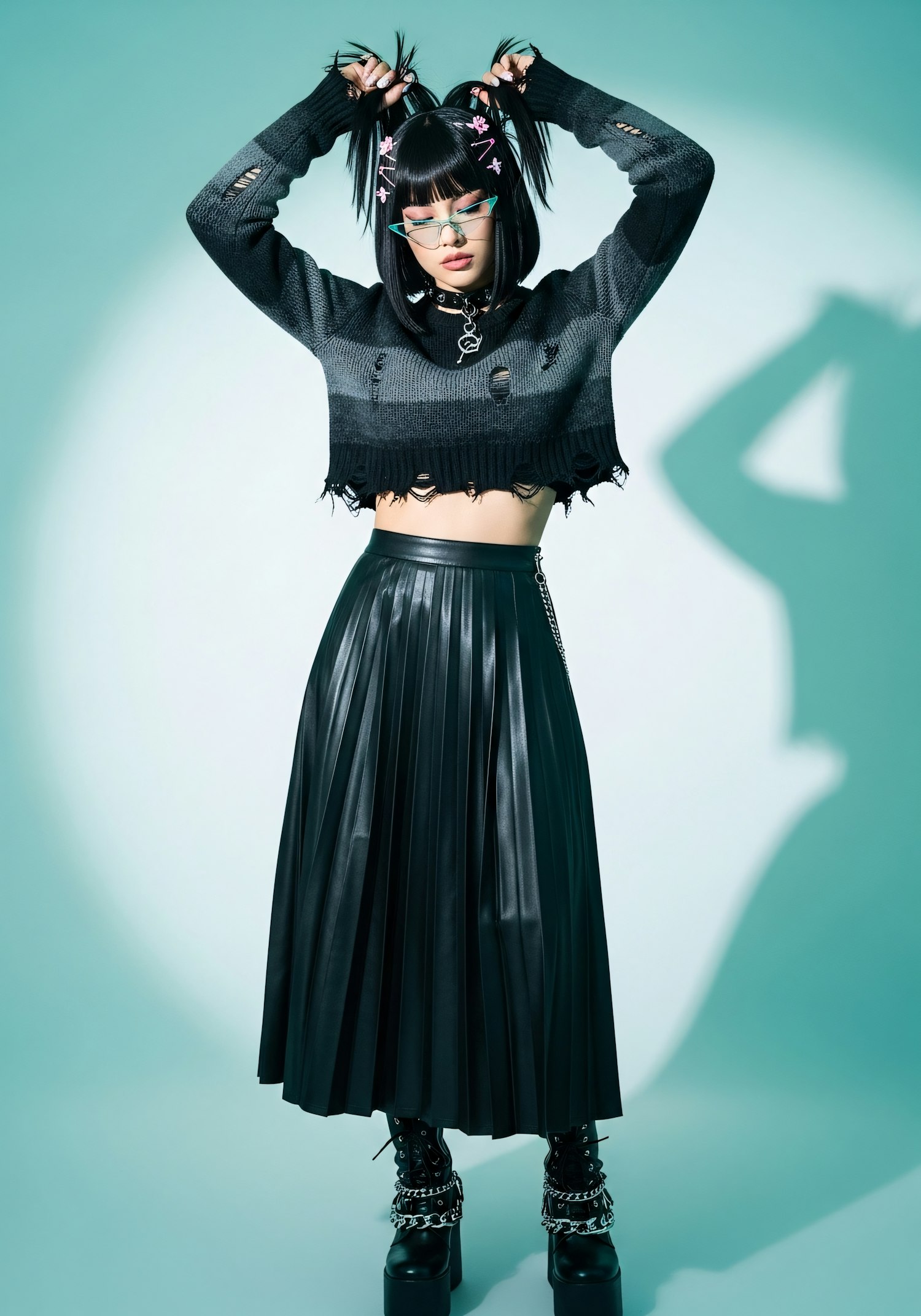 Stylish individual in a black outfit with pigtails and tinted glasses, posing against a teal background with a modern aesthetic.