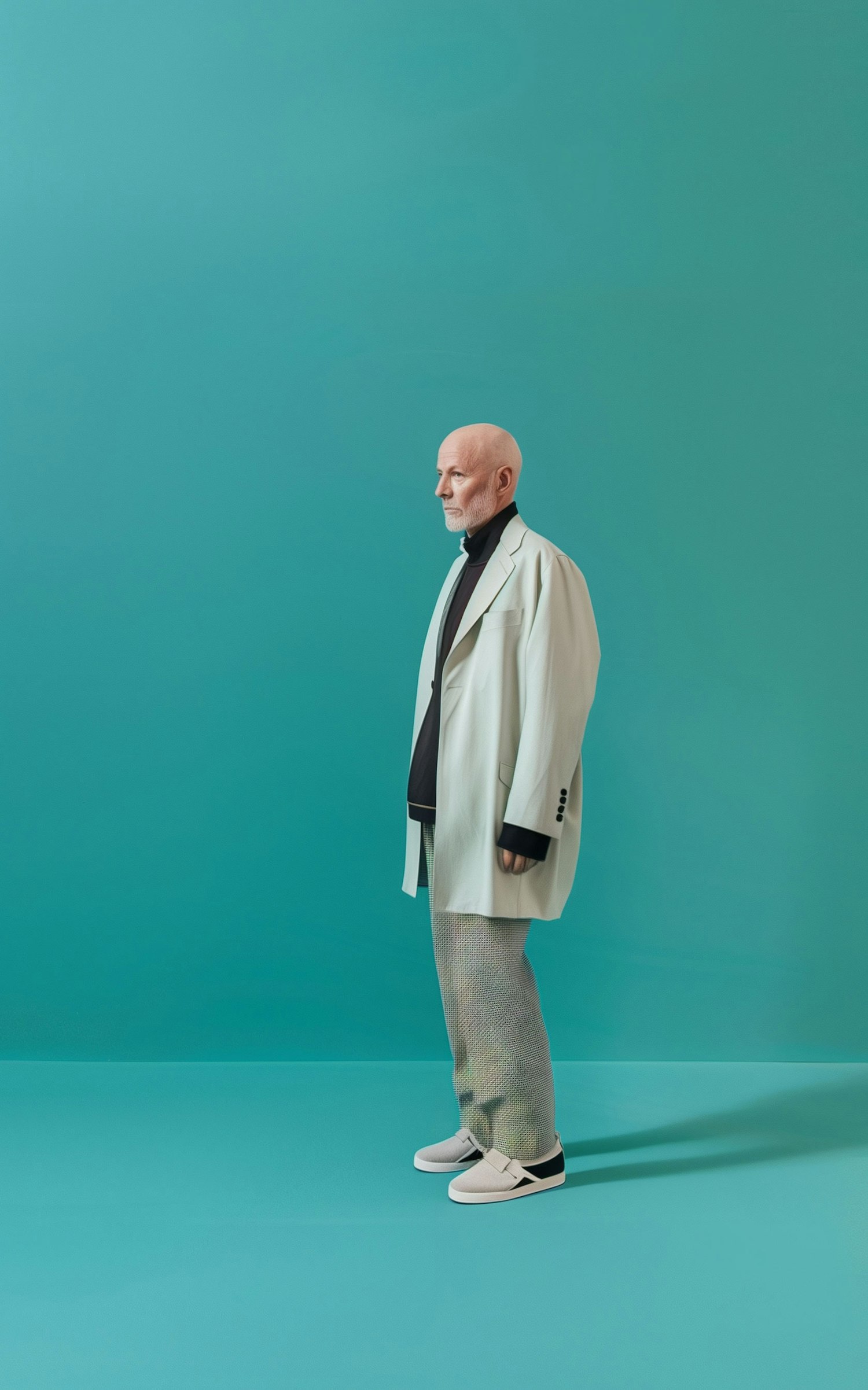 Bald man in oversized blazer and turtleneck stands against a teal background, showcasing modern fashion style.