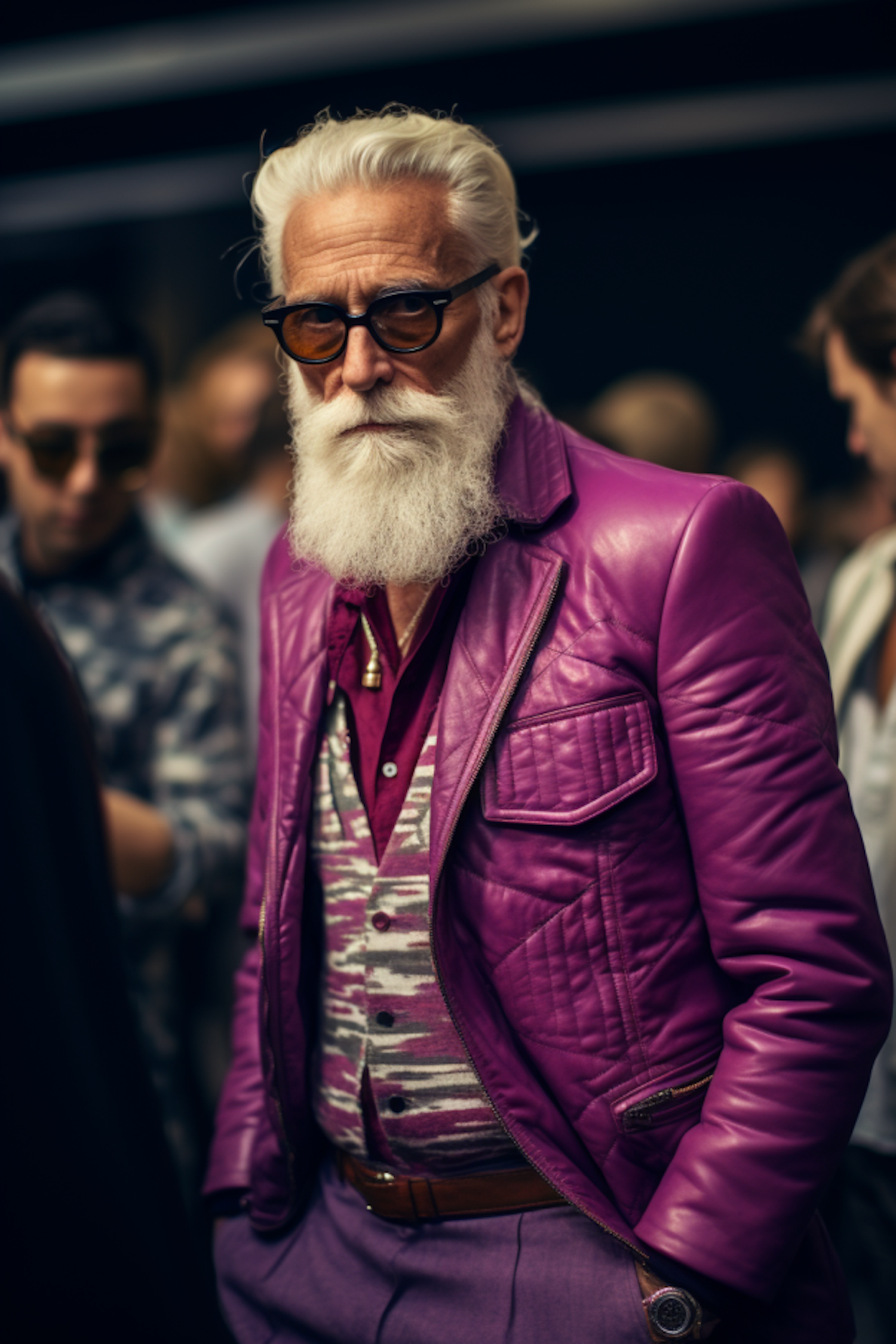 Stylish older man in purple leather jacket and sunglasses, exuding confidence and fashion-forward flair.