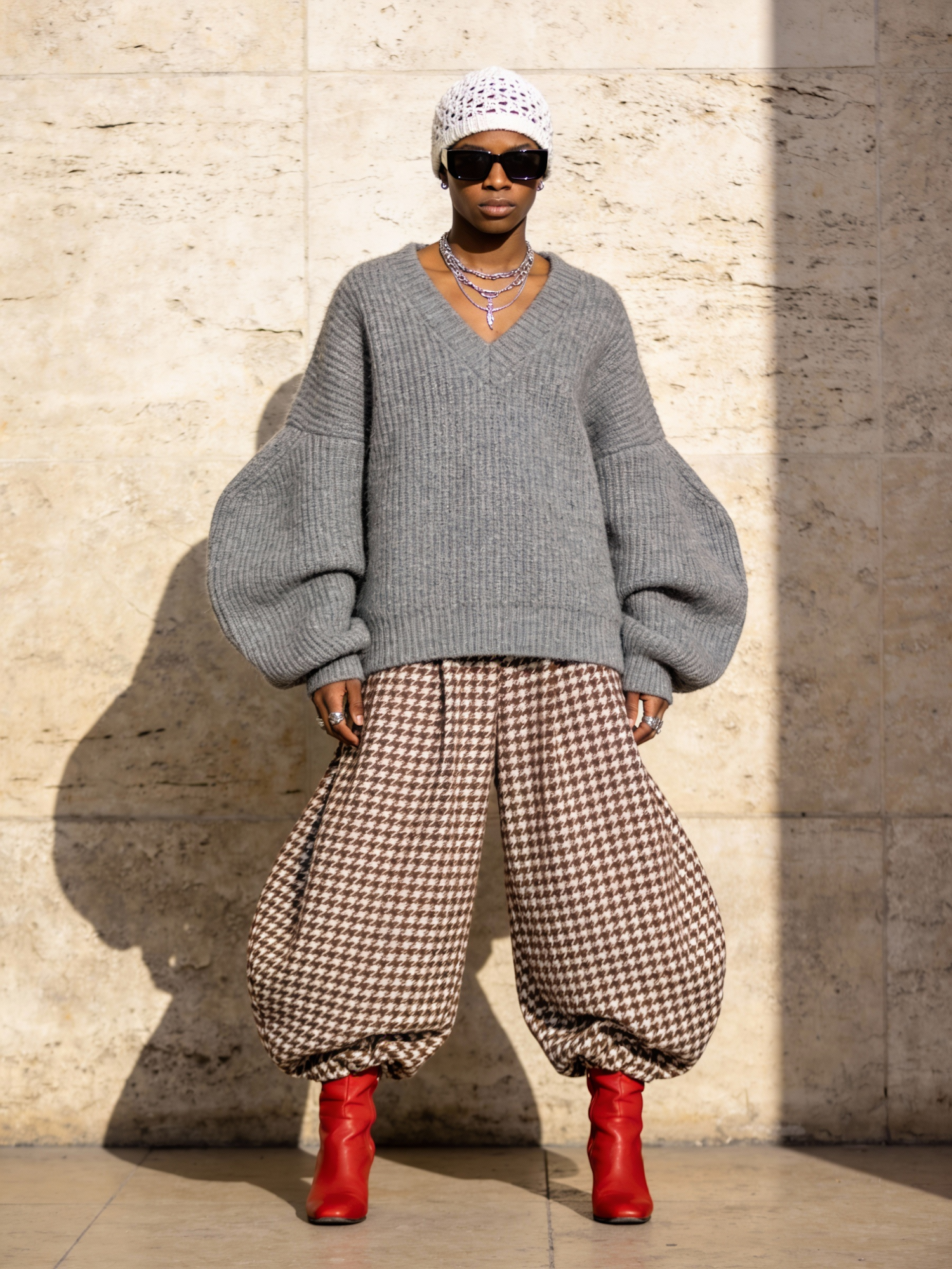 A fashion-forward A Black individual stands against a beige stone wall in a Scandinavian-inspired streetwear editorial. They wear a chunky oversized grey V-neck sweater with voluminous sleeves, paired with loose-fitting high-waisted brown and white houndstooth pants gathered at the ankles to create a balloon silhouette. Red boots add a bold accent. Accessories include a white crocheted beanie, black rectangular sunglasses, and layered silver necklaces. The lighting is soft and natural, casting gentle shadows across the stone texture and emphasising the contrast between knitwear, patterned fabric, and bold accessories. The composition is editorial and composed, celebrating eccentric layering and confident styling