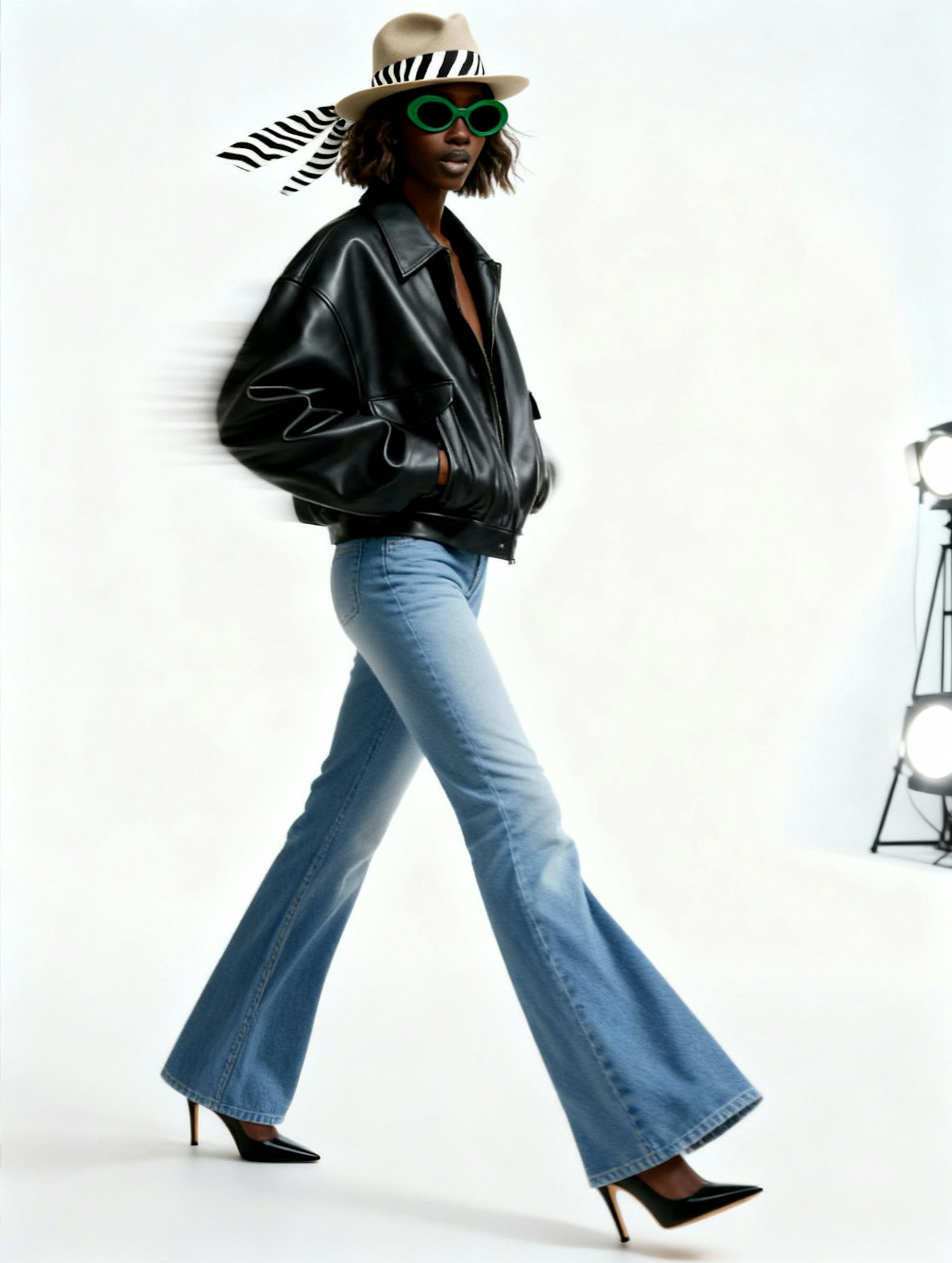 A fashionable person in a leather jacket, flared jeans, and a hat with green sunglasses, walking confidently in a studio setting.