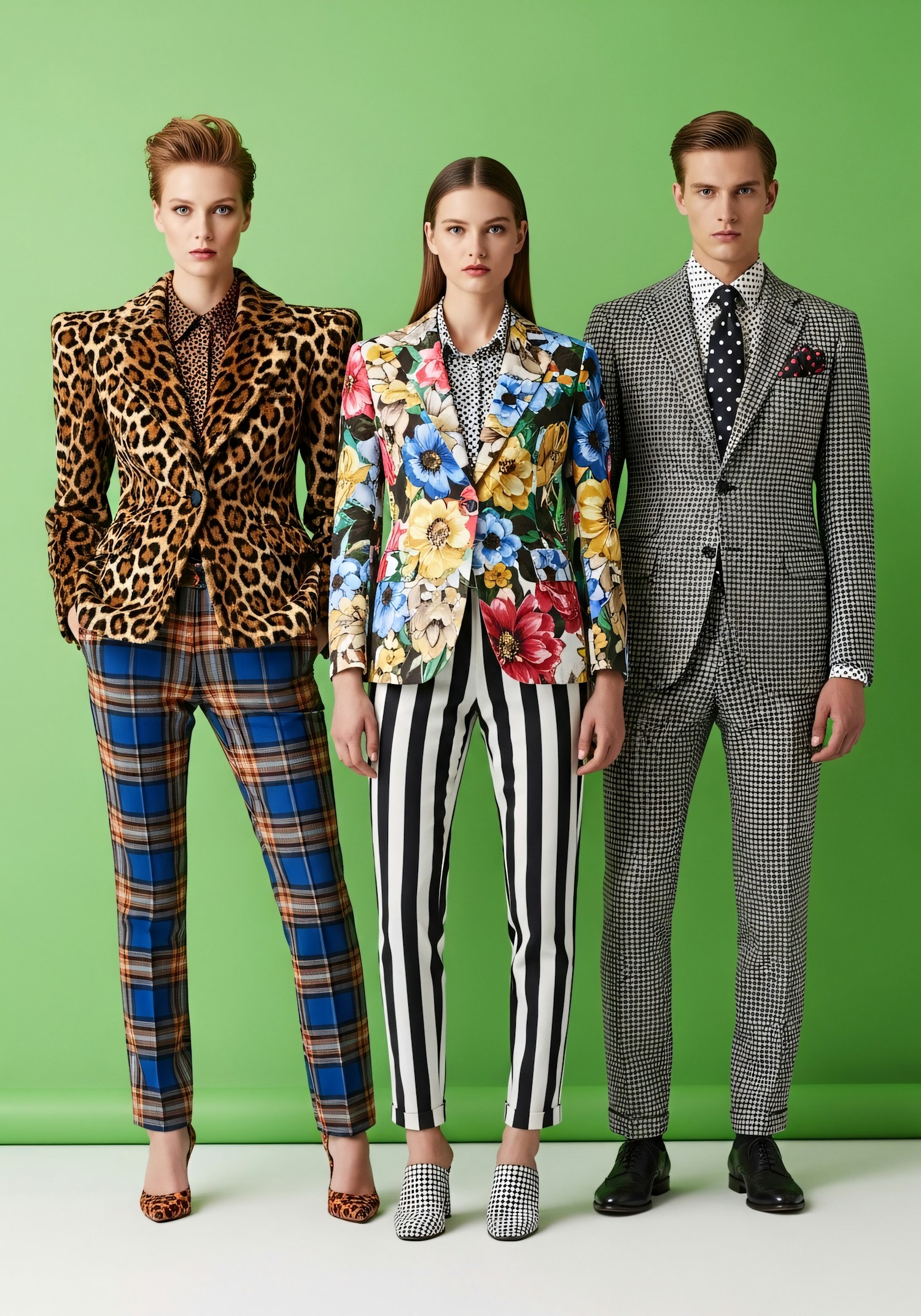 Three individuals showcase bold patterned suits against a green backdrop, featuring leopard print, floral, and houndstooth designs.