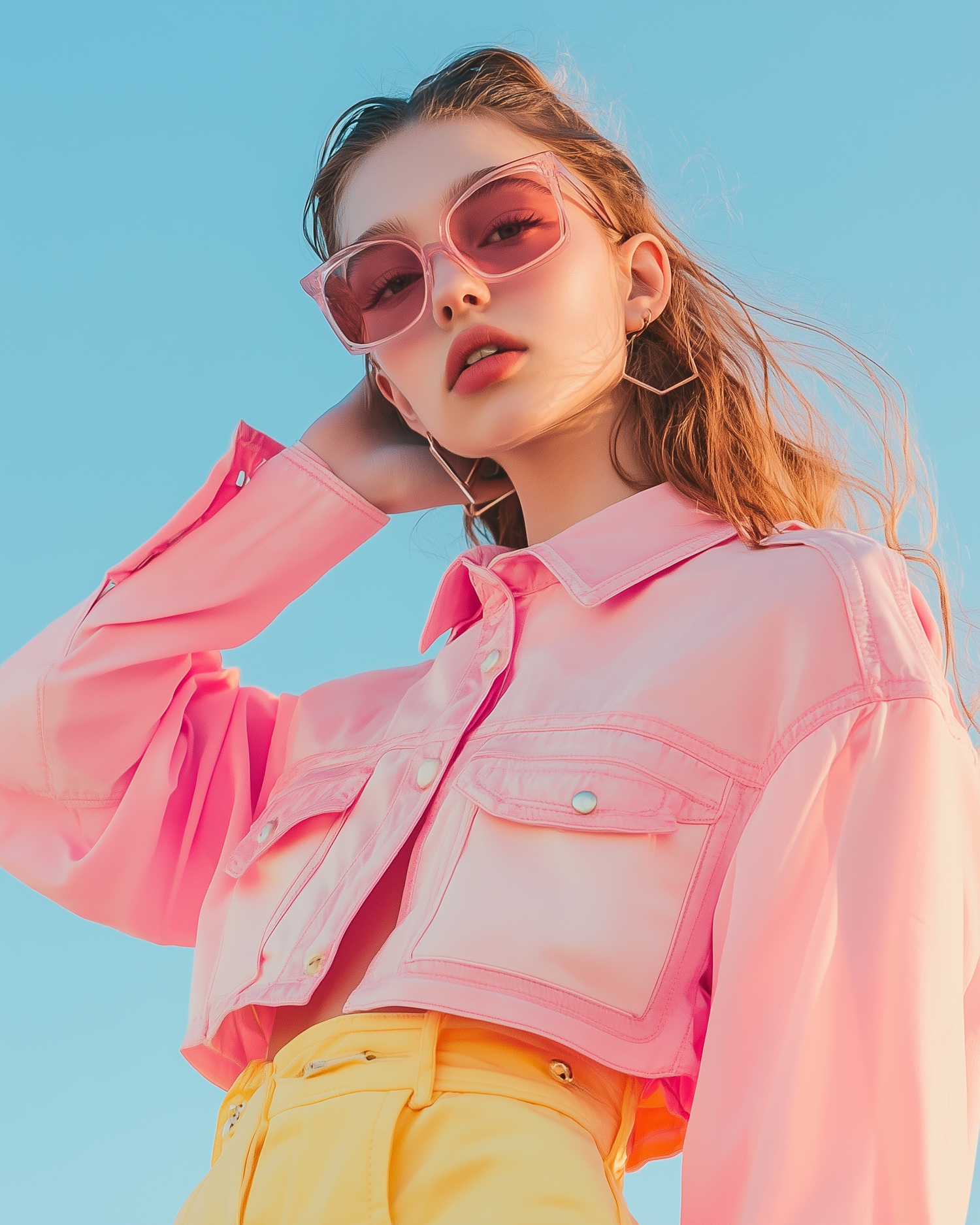 Stylish woman in pink sunglasses and jacket with yellow pants against a blue sky, exuding confidence and vibrant fashion.