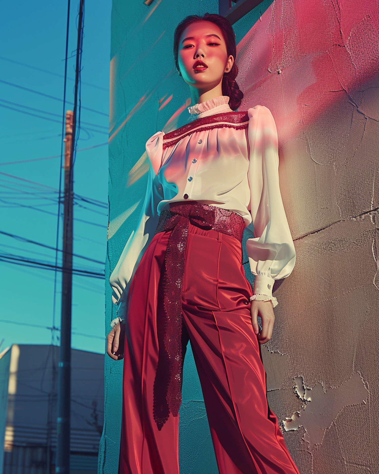 Stylish woman in red and white outfit poses against a textured wall with dramatic lighting and urban backdrop.