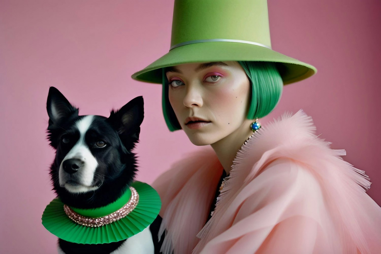Stylish portrait of a woman in green hat and wig with a dog in matching collar, set against a pink background.