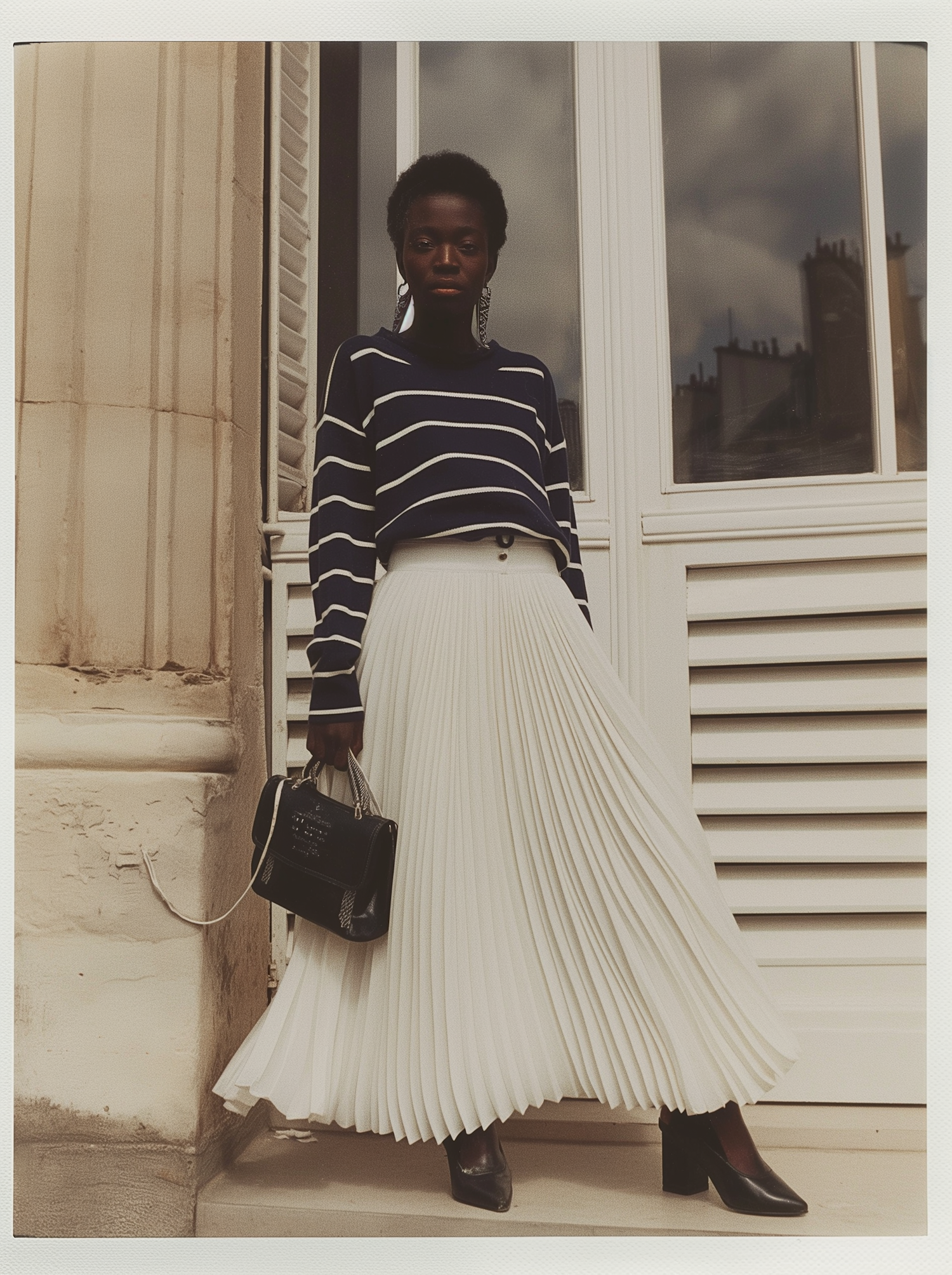 Stylish woman in striped top and pleated skirt, holding a black handbag. Elegant urban fashion with architectural backdrop.